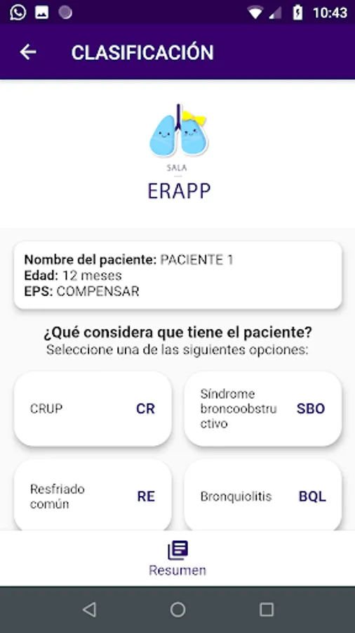 Tool aimed at health professionals for clinical evaluation and follow-up in patients entering the ERA ward with different diagnoses such as CRUP, ASMA, bronchoobstructive syndrome, among others.