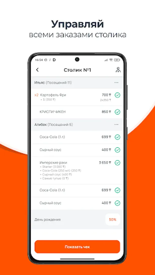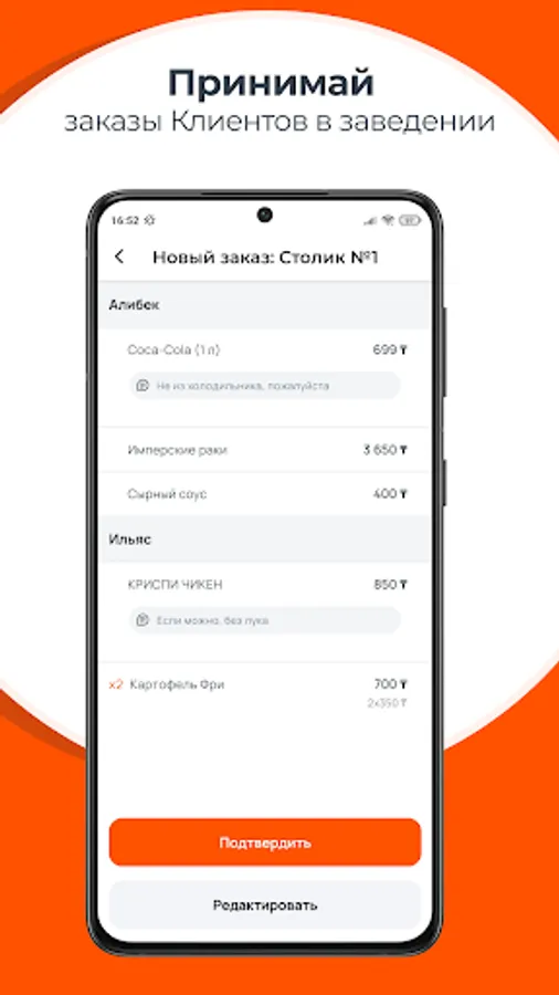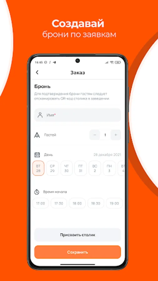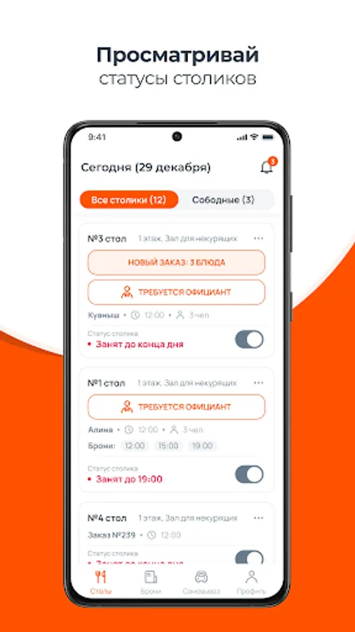 Keep track of current requests, change statuses, and view table reservations. No client will go unnoticed.