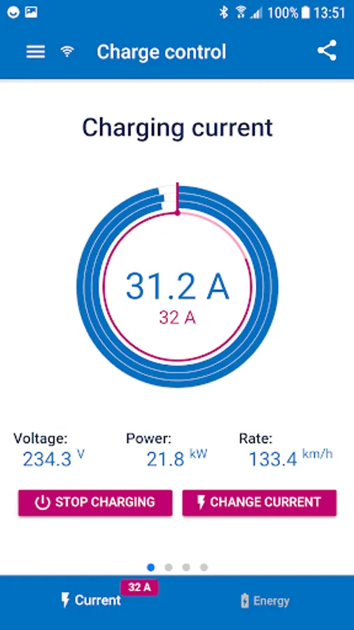 Control your NRGkick Classic comfortably from your smartphone and configure and use many smart features. Configure settings for photovoltaic-led charging or automatic reports via email, set the charging power and charging current, and get access to the device-integrated energy meter. Always keep full track of your charging processes! The NRGkick Classic app visualizes various parameters such as voltage, current, power and energy. You can change the current during charging in 1A increments from 6A-32A. Charging cost, average energy consumption, range, CO2 savings and other useful information are displayed and recorded.
