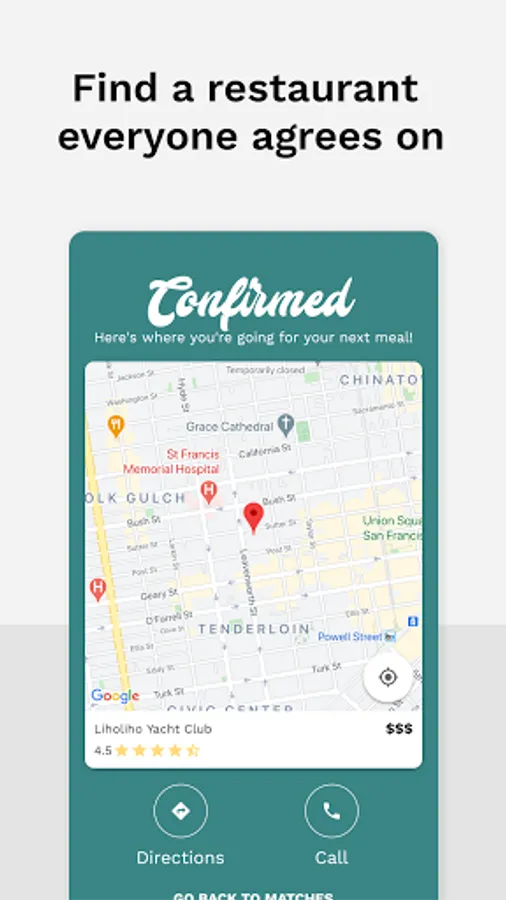 Create a room and dine on in! Dinner Mate helps you and your friends answer the age-old question: "Where should we eat tonight?" Create a room, share your code with your friends or significant other, and start swiping. The restaurants you all agree on will appear in your matches. Then, just select a match and go eat! You'll never hear "I don't care where we eat, you choose" again.