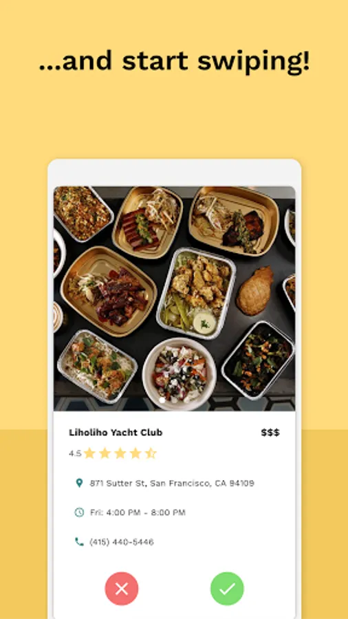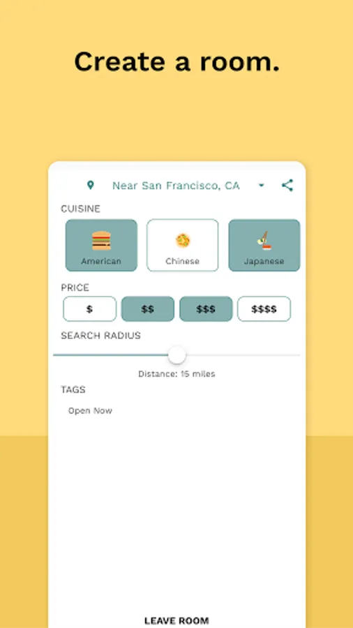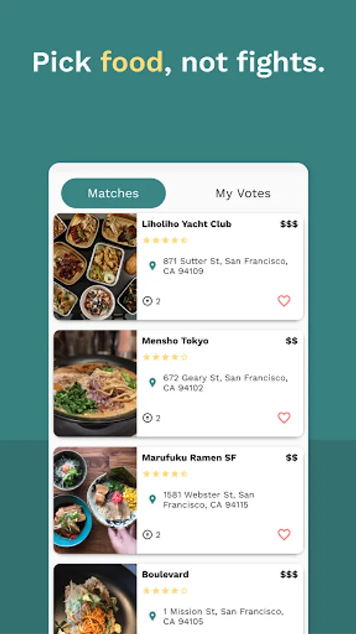 Dinner Mate finds restaurants near you. You choose the cuisine, price, and distance, then start picking. Don't know what kind of food you want to eat? No problem, leave it blank and let Dinner Mate show you all the interesting options nearby.