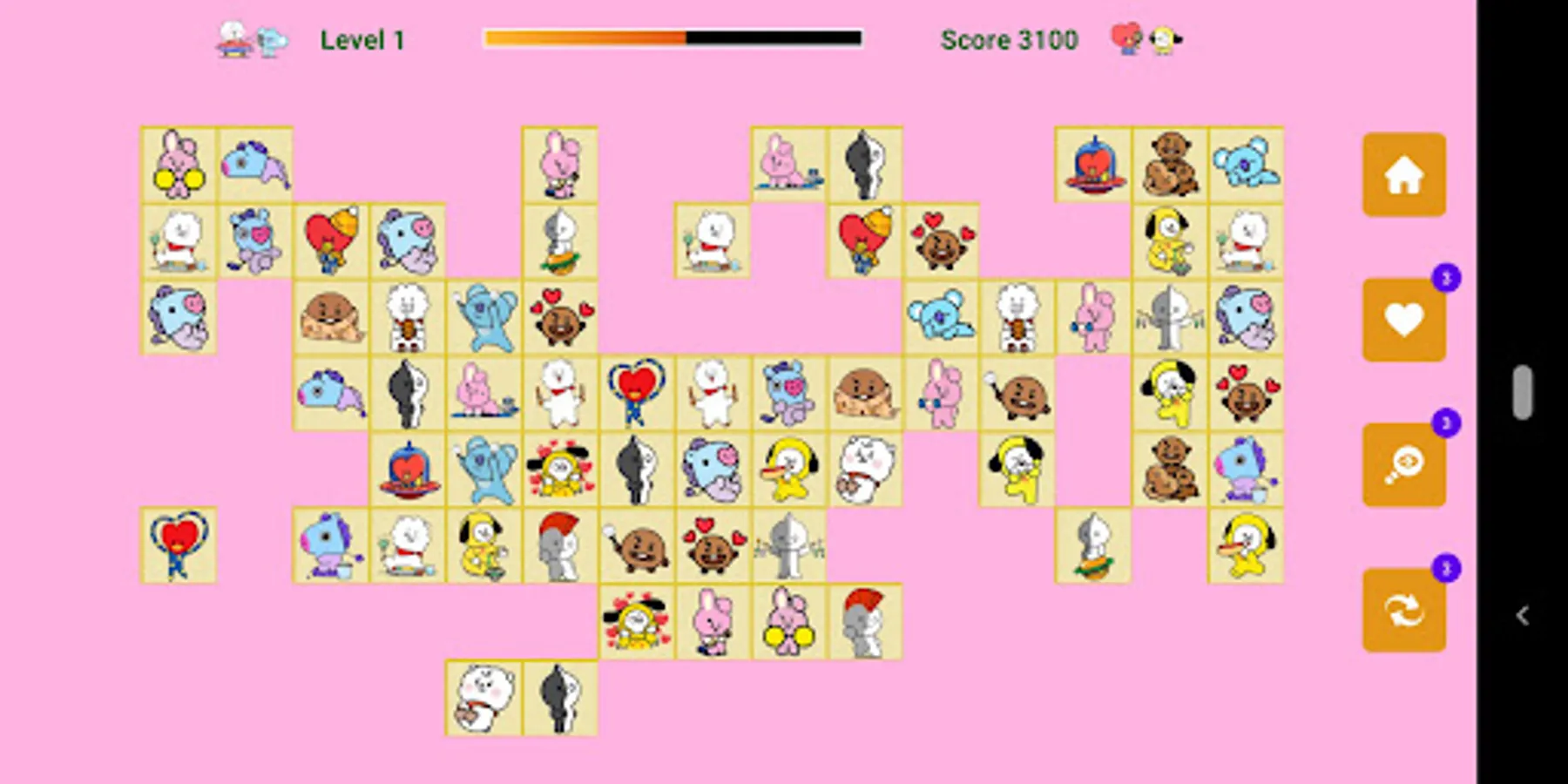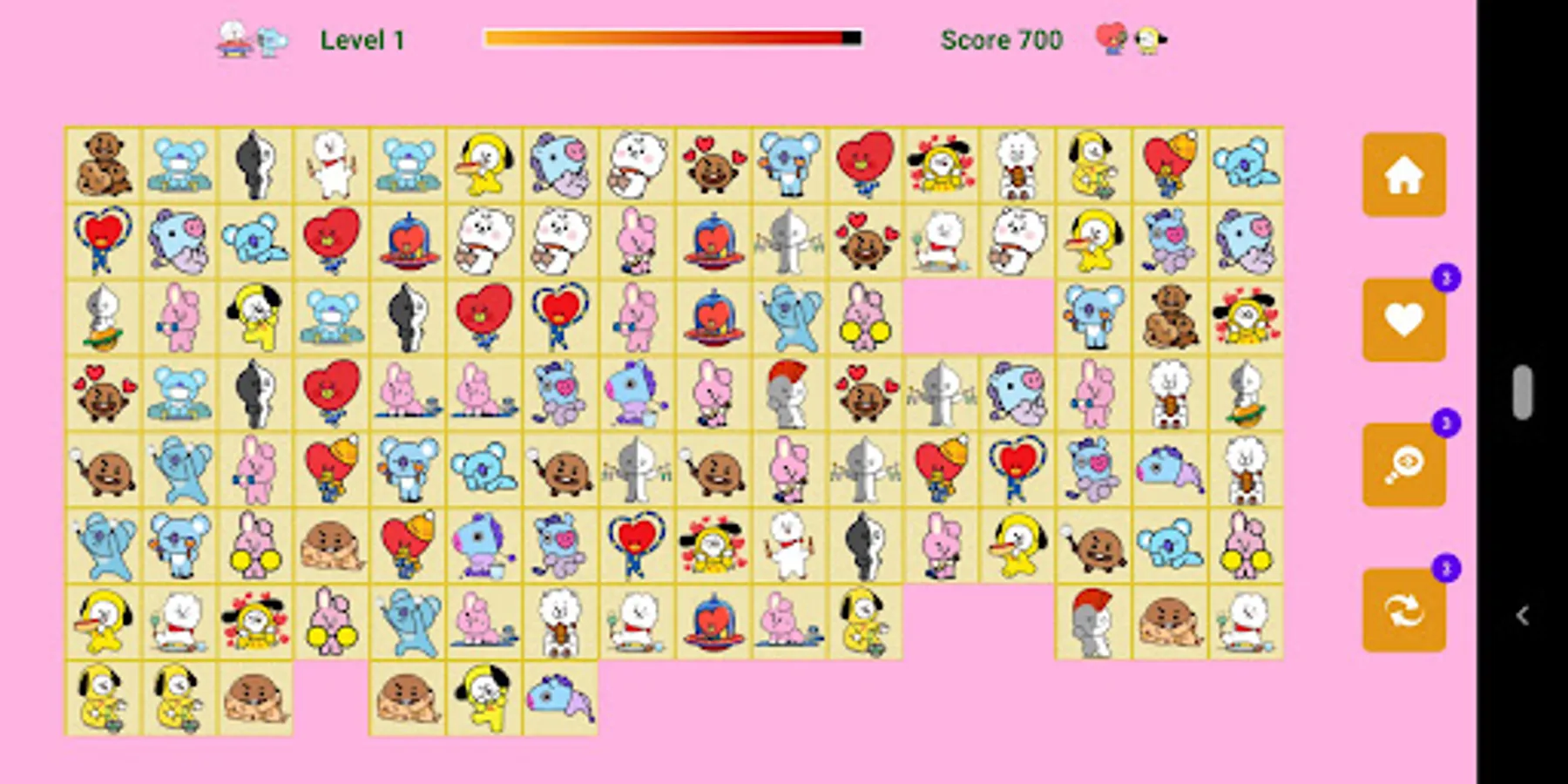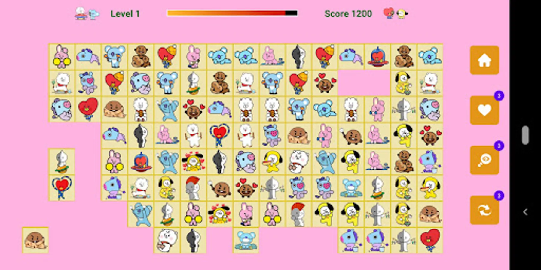 BTS BT21 Onet Connect game has 16x8 squares (128 tiles). Each box is a BT21 image of a BTS member. Just connect 2 squares of the same shape to score points and your score will increase rapidly as you connect more shapes. How many levels can you play? It's not an easy task!
