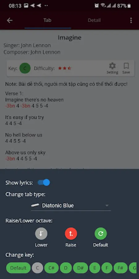 - Convert tab by types of trumpet, increase/reduce interval or change Tone.