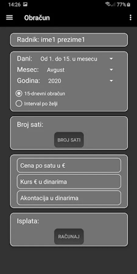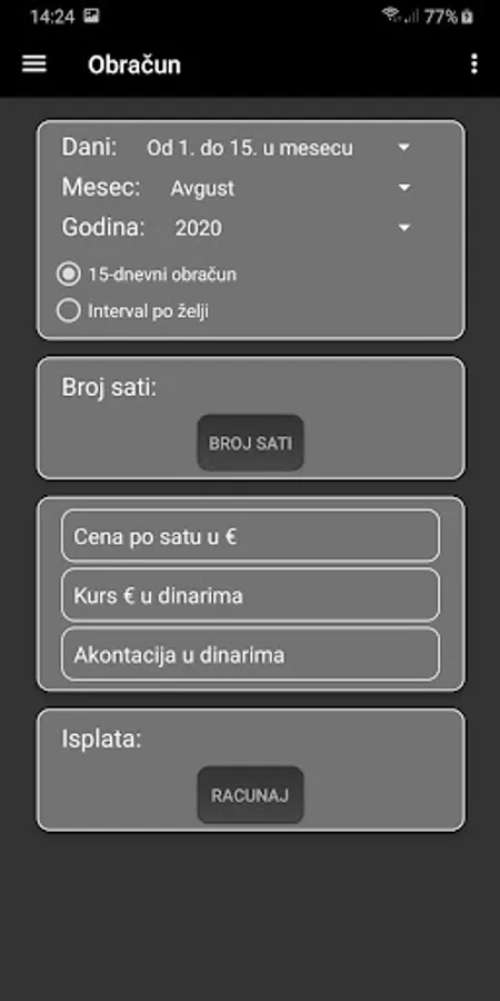 -Calculation in which the calculation period is chosen, which can be 15-day or as desired, and where the hourly rate, possible advance payment is taken, as well as the euro exchange rate in dinars.