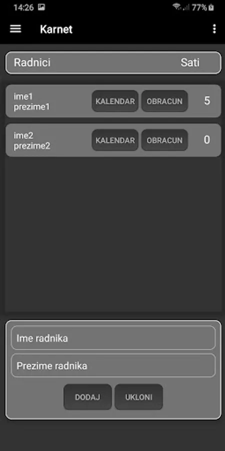 The carnet records the hours of a group of workers on a particular construction site or some other type of work. On this page, workers can be added or removed by entering their names and surnames. to the 15th or from the 16th to the end of the month, depending on which part of the month is the day for which the hours are kept.When the date passes to the 1st or 16th of the month the hours for the previous period are deleted, but only in the part where The list of workers is displayed. The hours for any worker for any period can be seen by entering in the calculation or calendar for each individual worker.