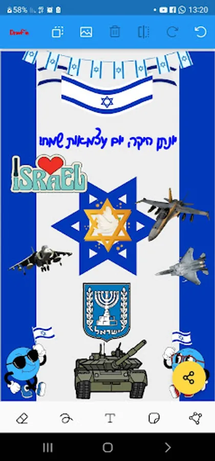 עיצוב גלויות ברכה לחגי ישראל (ראש השנה, יום כיפור, סוכות, שמחת תורה, חג חנוכה, טו בשבט, פורים, יום הזיכרון, יום העצמאות, לג בעומר, חג השבועות, צום ט באב) ימי הולדת, יום האהבה, יום נישואין, חתונה ולכל אירוע, הזמנה לאירוע, ברכה או הודעה מגניבה בכל תחום תוך שימוש ממאגר מדבקות נמתחות שניתן גם לסובב אותן על המסך,