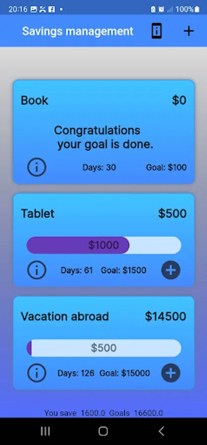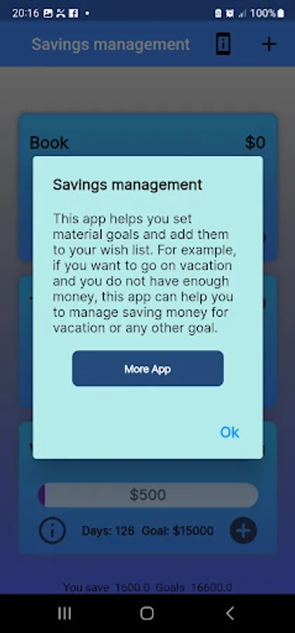 This app helps you set material goals and add them to your wish list. For example, if you want to go on vacation and you do not have enough money, this app can help you to manage saving money for vacation or any other goal