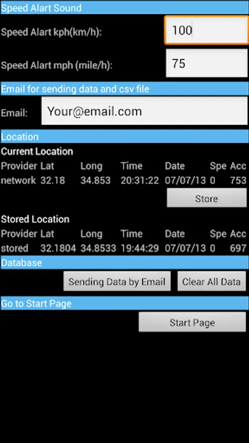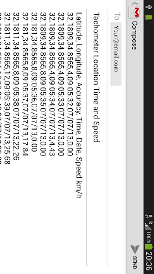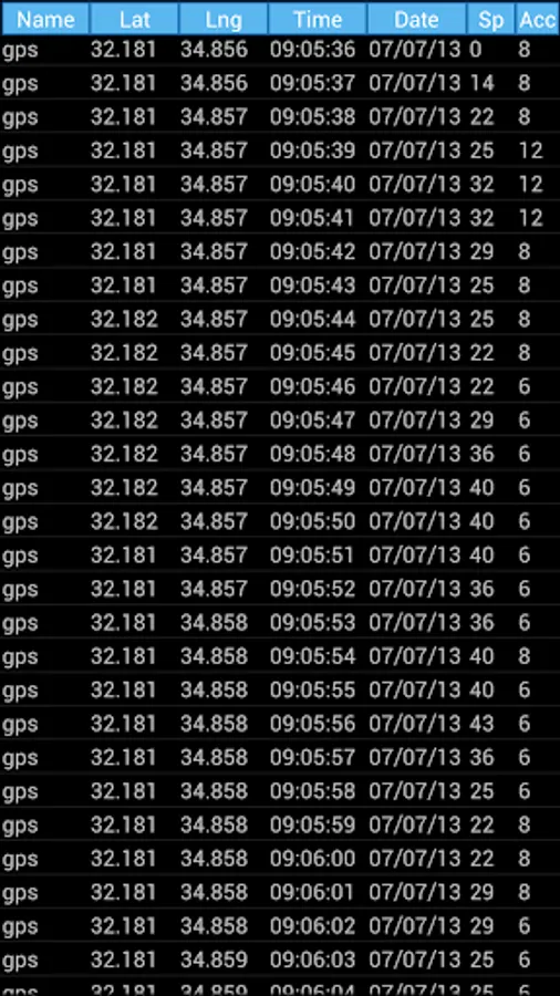 Latitude, Longitude, Accuracy, Time, Date, Speed km/h.