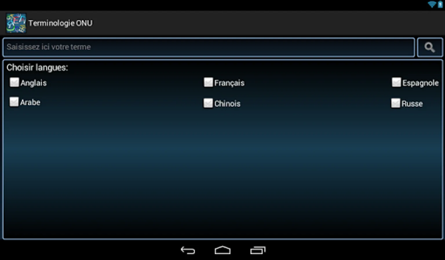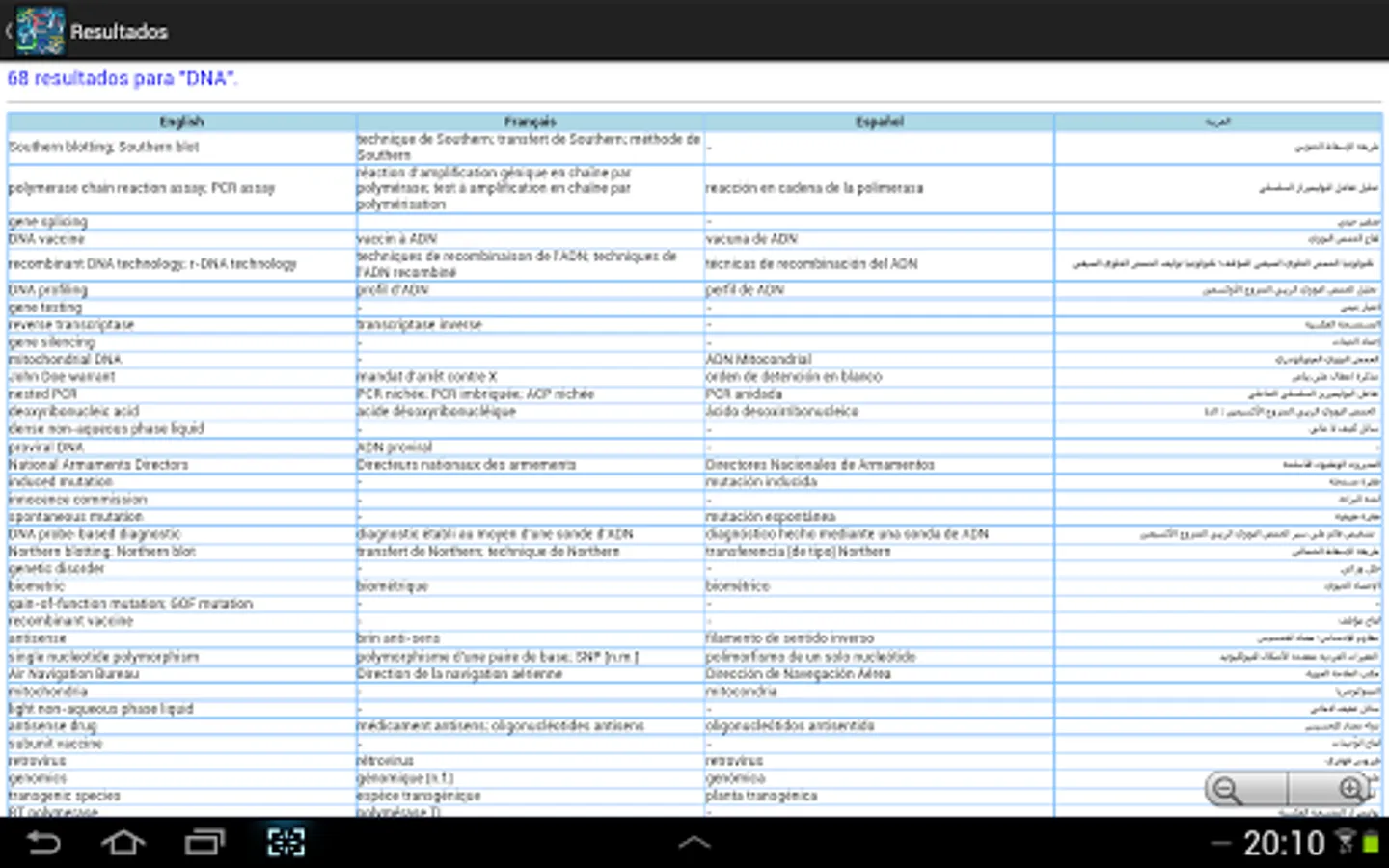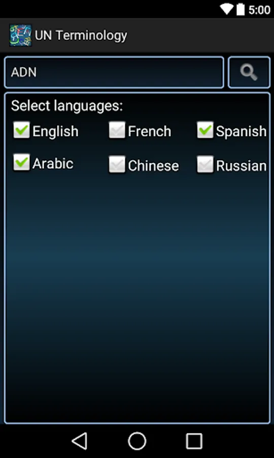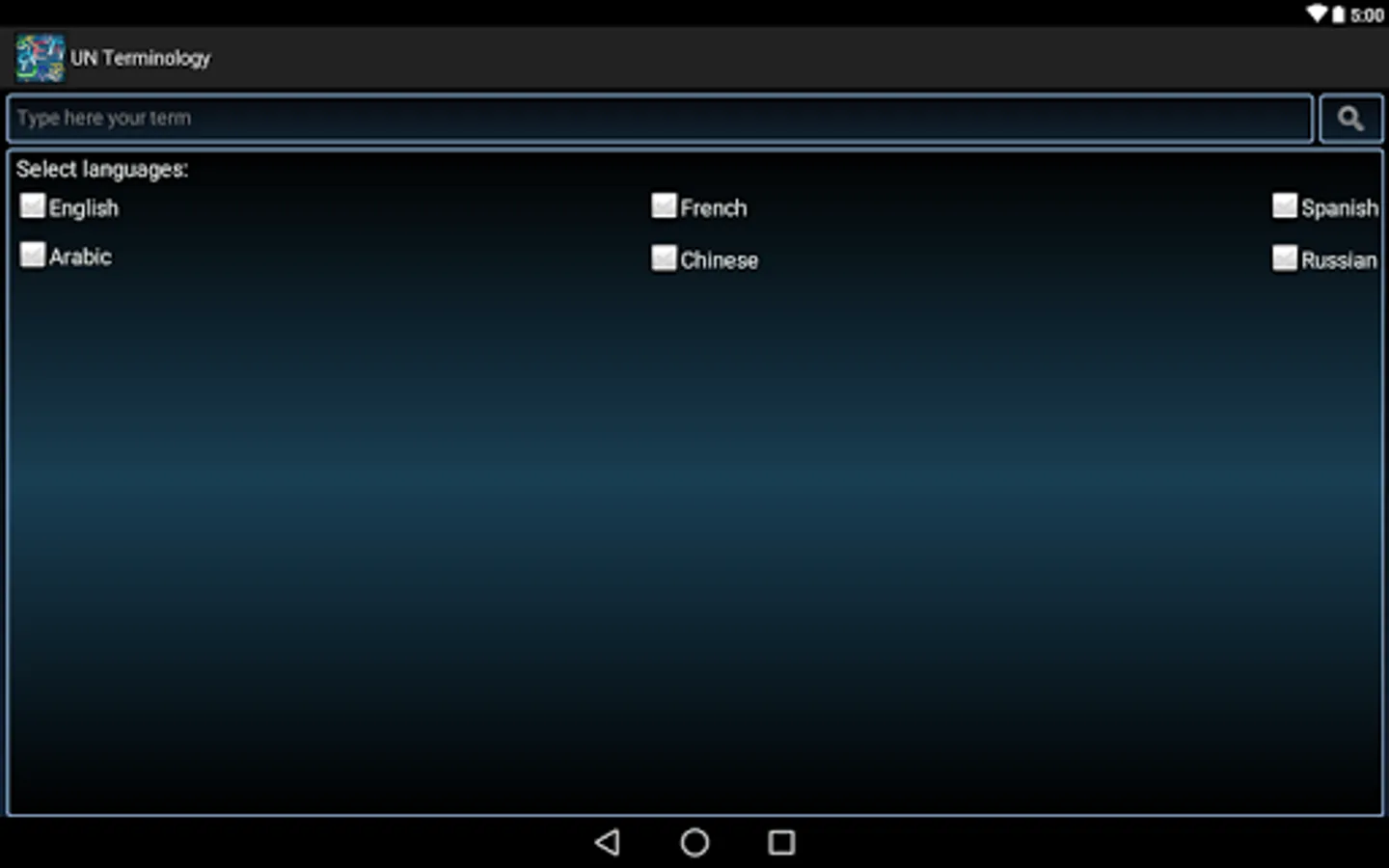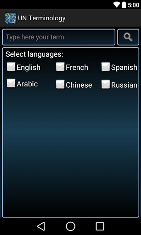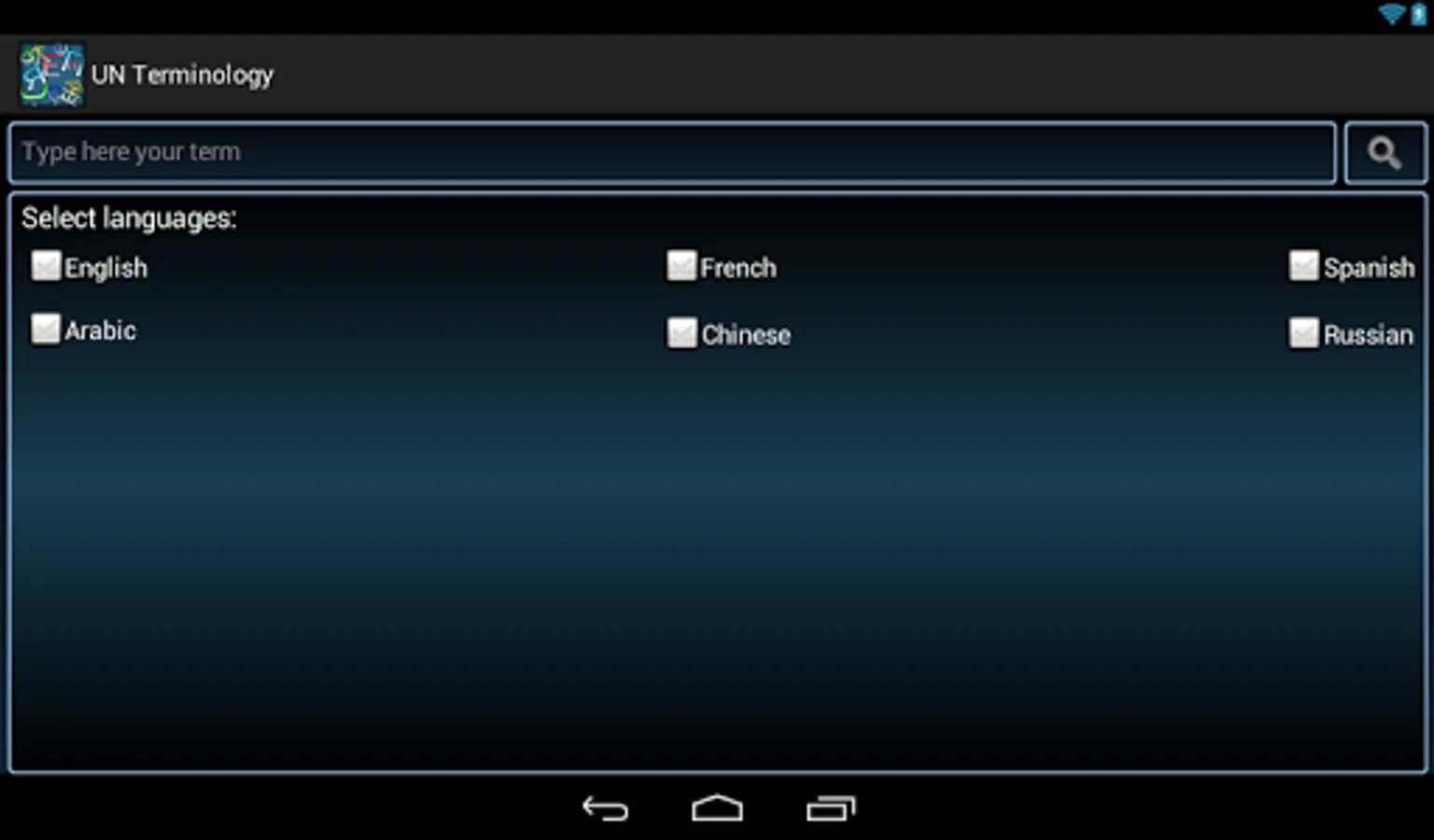 "UN Terminology" allows you to write any term in any language mentioned above and tick any language available to make a search. Also, you can see the results in just one language. This is useful to look up synonyms.