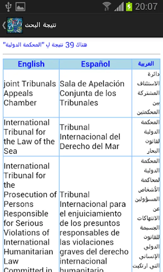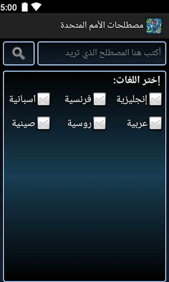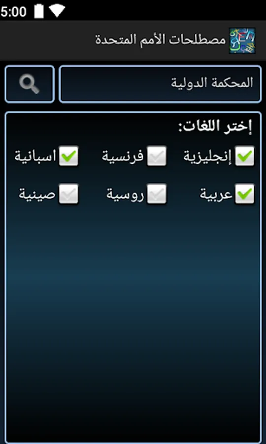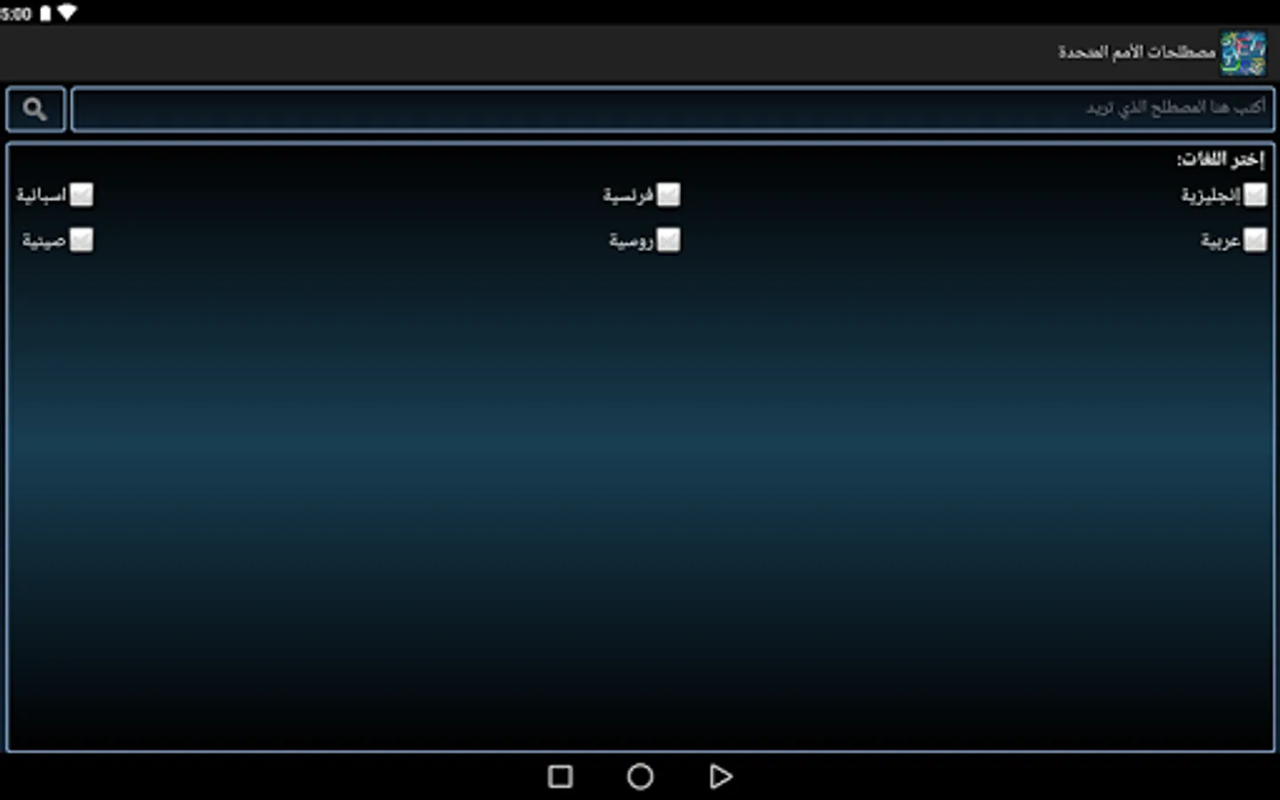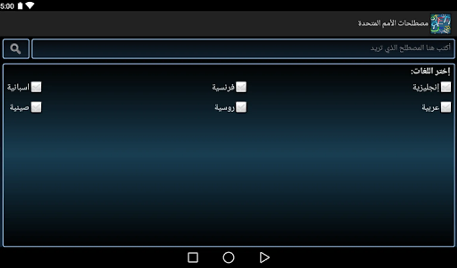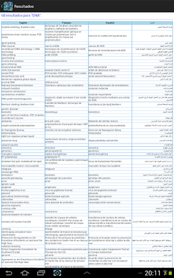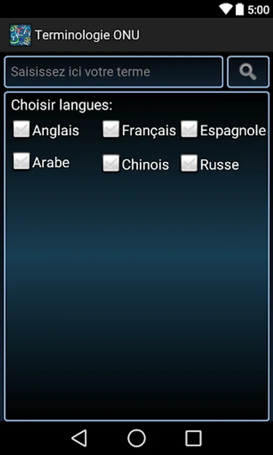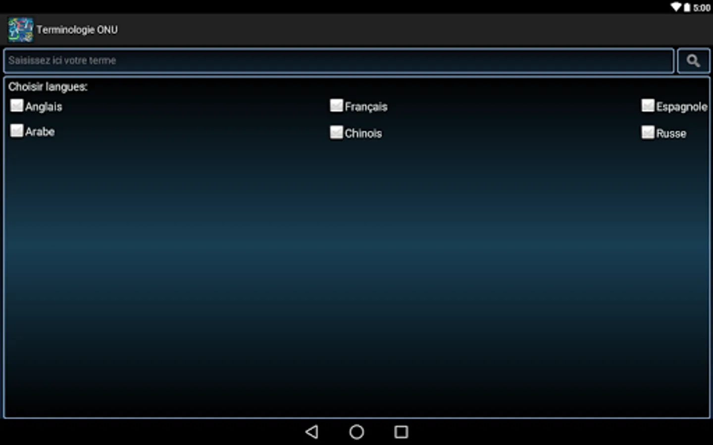 "UN Terminology" allows you to write any term in any language mentioned above and tick any language available to make a search. Also, you can see the results in just one language. This is useful to look up synonyms.