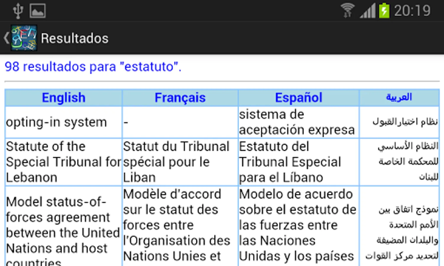 The database "UNTERM" is relational and any results are presented in the context or scope of the term introduced, increasing the usefulness and richness of this application. So, UN Terminology, is a multilingual linguistic tool (it can be used as a dictionary, a glossary, a compendium of terms and a large vocabulary) to use in the legal, economic, political, social, human rights and NGO scope; useful, fast and handy, very valuable for translation work and, in general, useful for linguists, philologists, journalists, anthropologists, scientists generally and students.