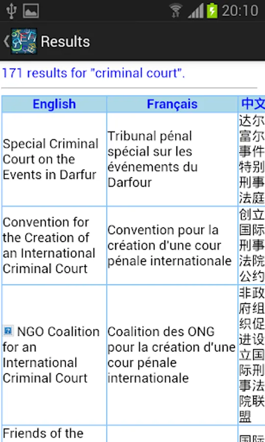 "UN Terminology" is a tool that allows you to access to United Nations Multilingual Terminology Database (UNTERM). The database contains more than 85,000 words and is updated daily.