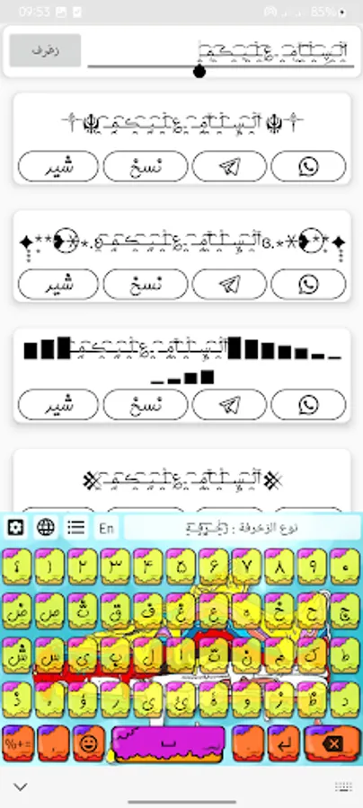 An interface for shapes that contains funny, distinctive and expressive shapes that you can copy or modify before copying and sharing them via "Facebook", "WhatsApp", "decorated keyboard", you can send the shape to the right person or share it on Facebook, loved ones and your best friends