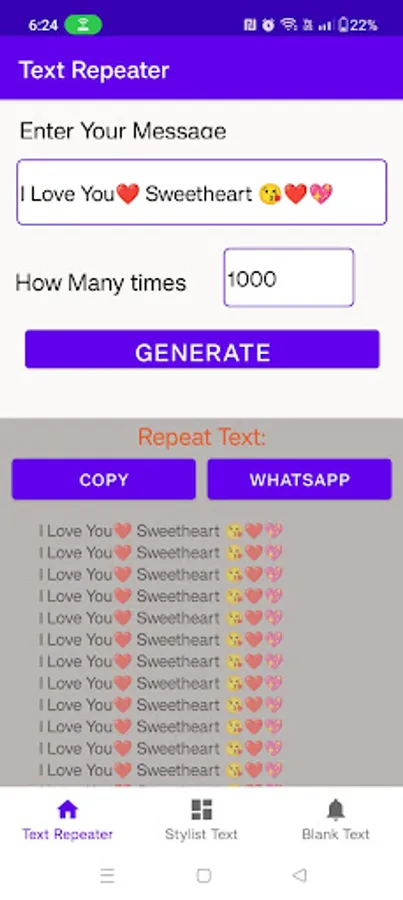 Text Repeater is a mobile app that allows users to repeat a piece of text a specified number of times. It is a fun and easy way to entertain your friends or prank them. You can also use it to generate test data or repeat a mantra or affirmation.