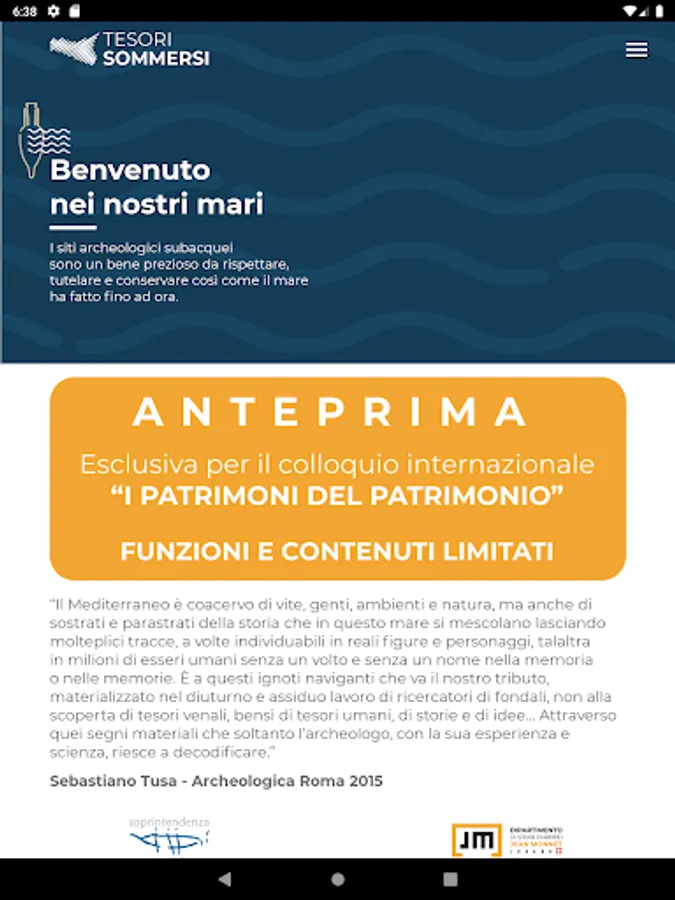 Grasping the primacy of the Sicily region which was the first in Italy, thanks to the intuition of the archaeologist prof. Sebastiano Tusa, established the Superintendence of the Sea, of regional scope. Using the techniques of GPS navigation, interactivity, ubiquity and multimedia typical of smartphones, it offers European students the possibility of crossing the specific contents of educational programs with the cultural values of the territory and the sea.