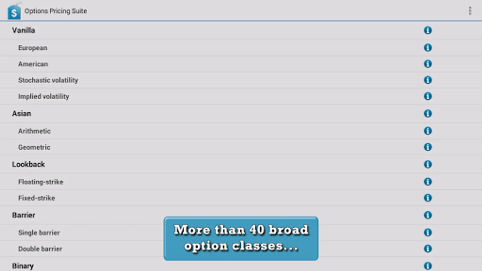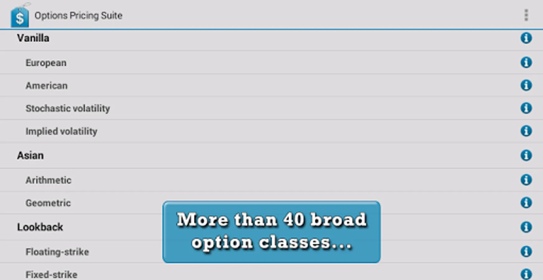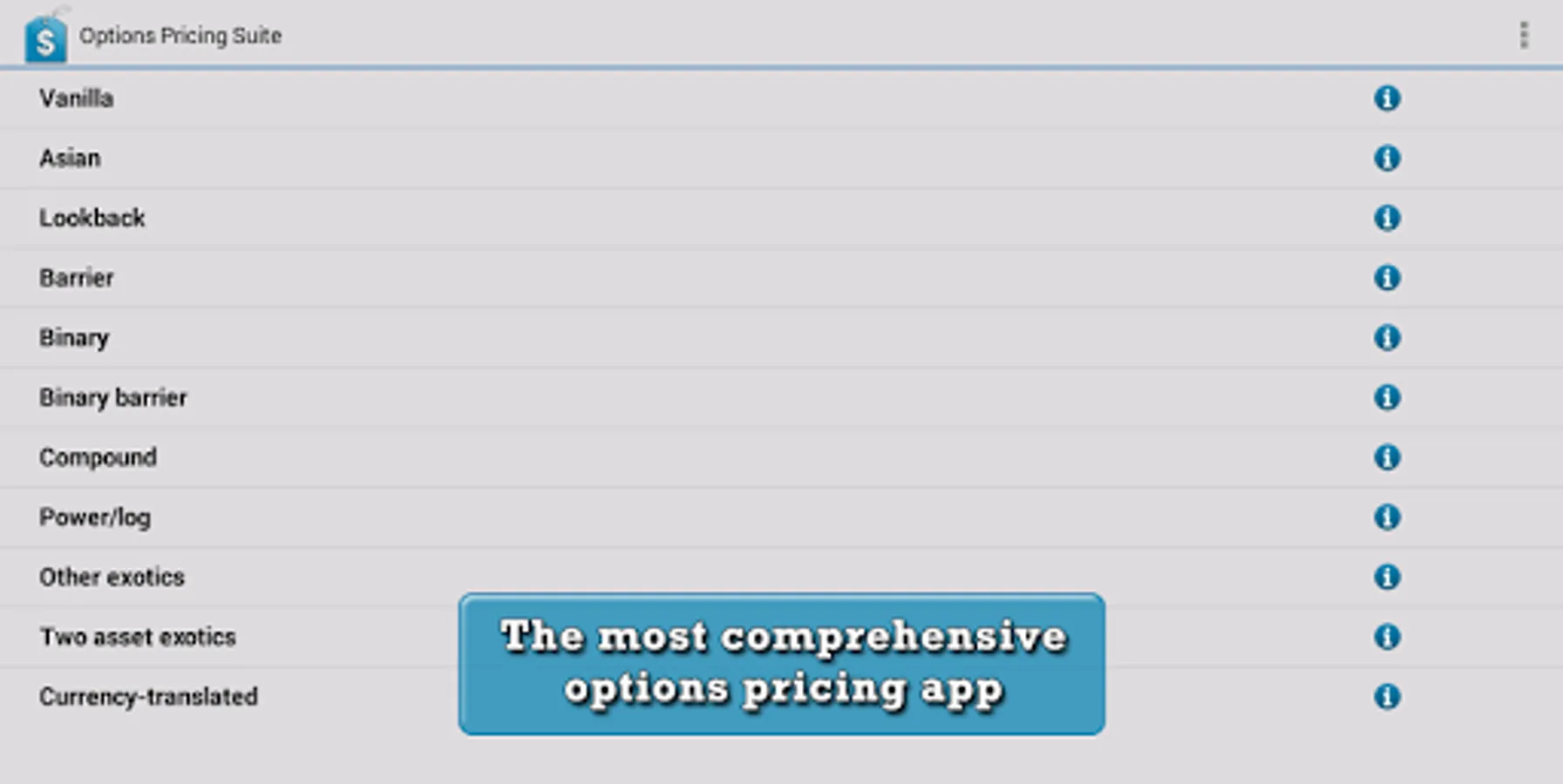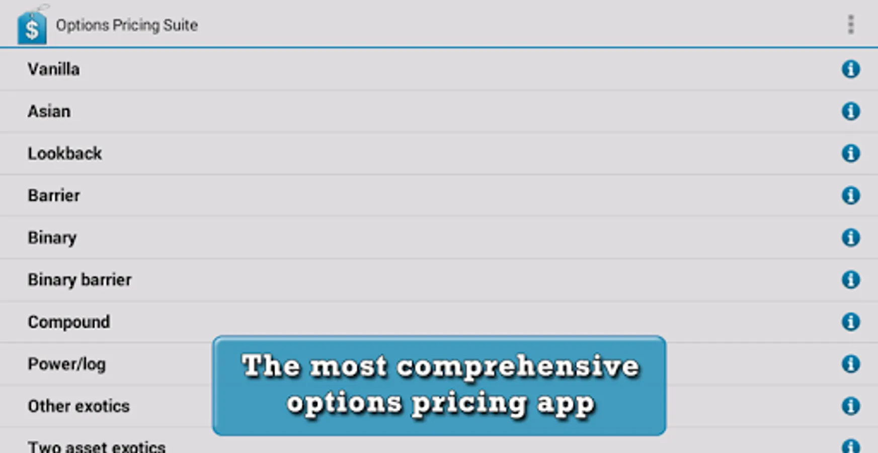 Options Pricing Suite is the most comprehensive app for financial option pricing and Greek calculation, with over 50 classes of options & strategies and more than 100 unique payoff types.