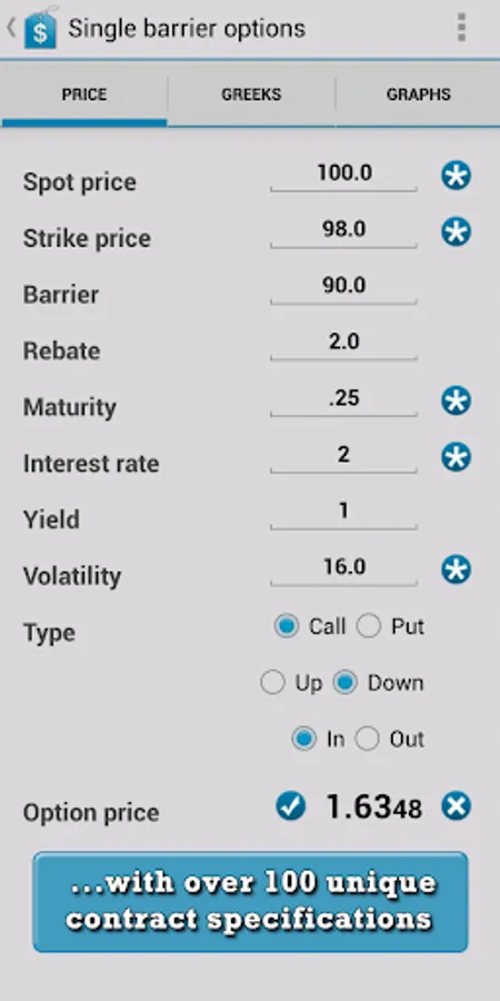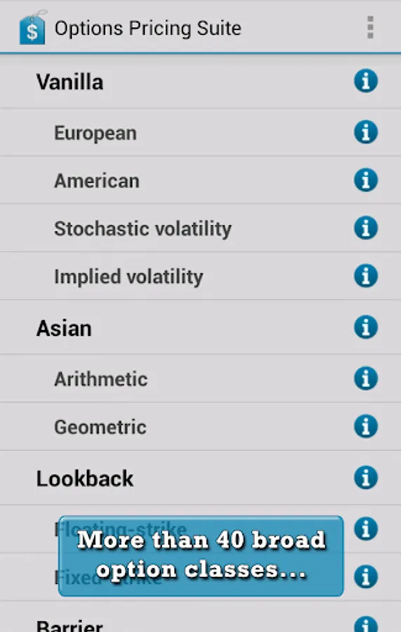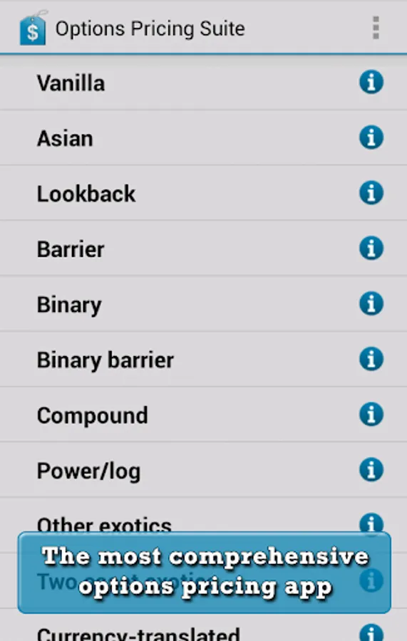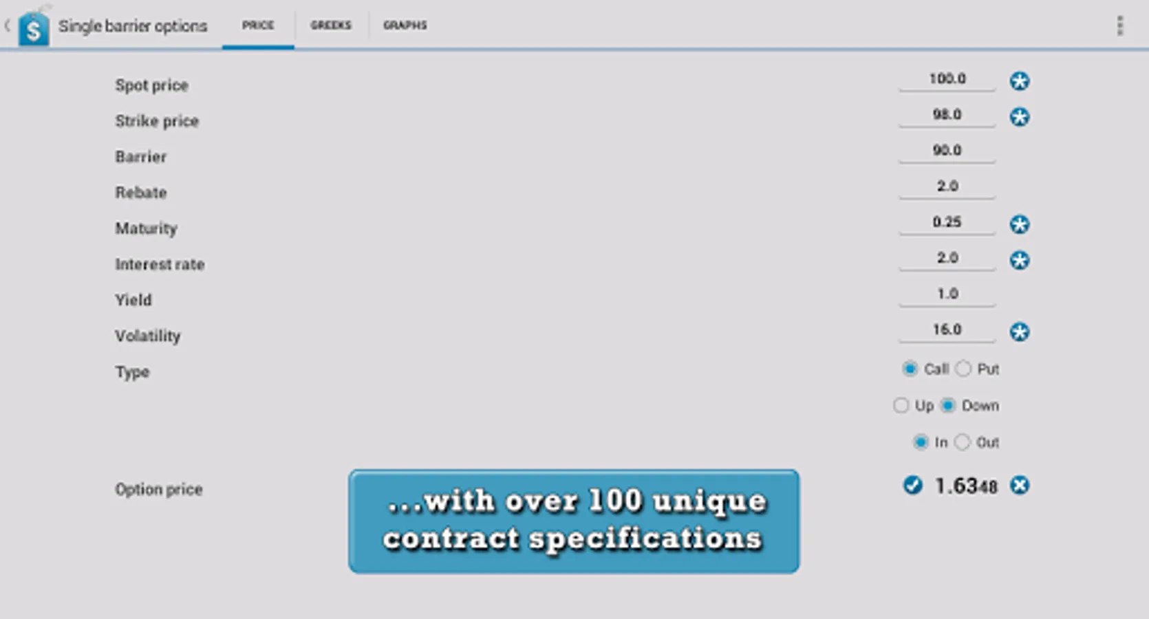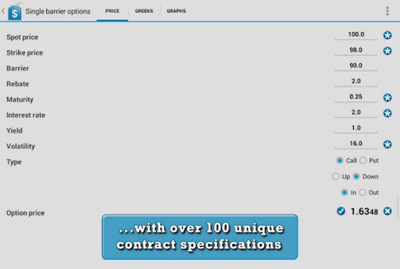 Options Pricing Suite is the most comprehensive app for financial option pricing and Greek calculation, with over 50 classes of options & strategies and more than 100 unique payoff types.