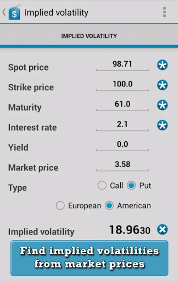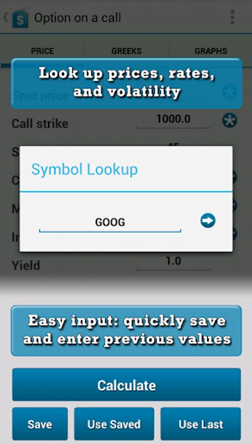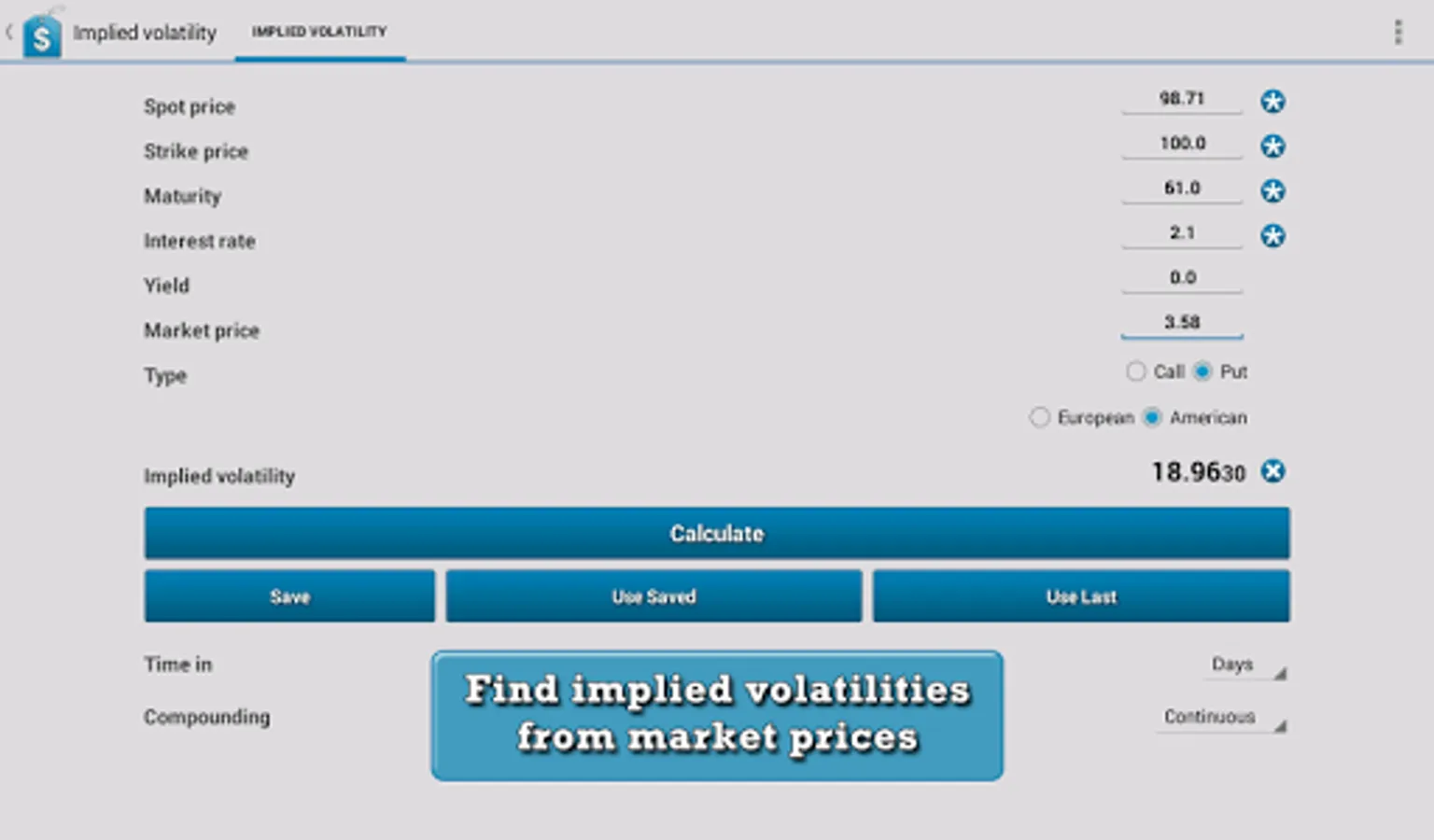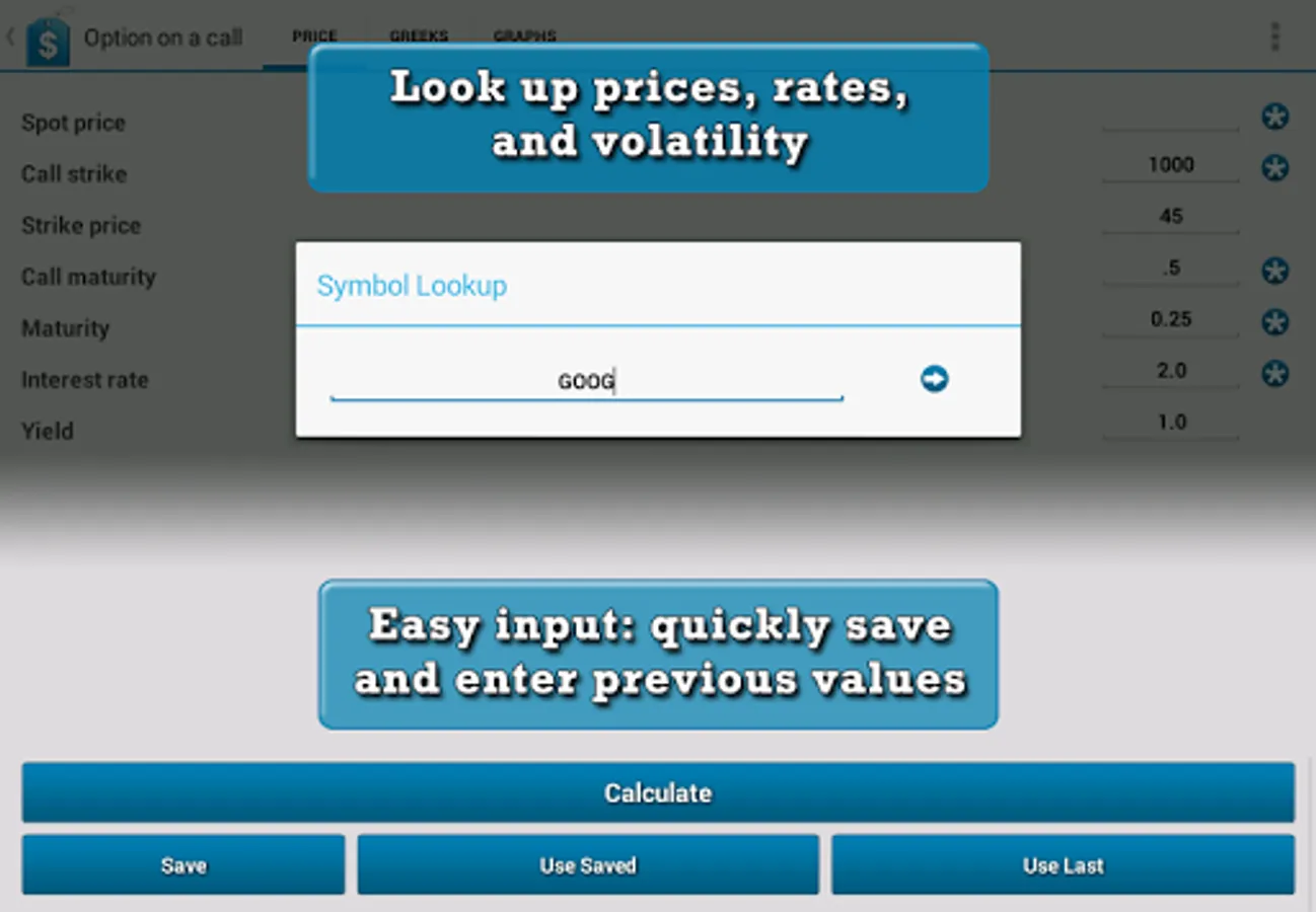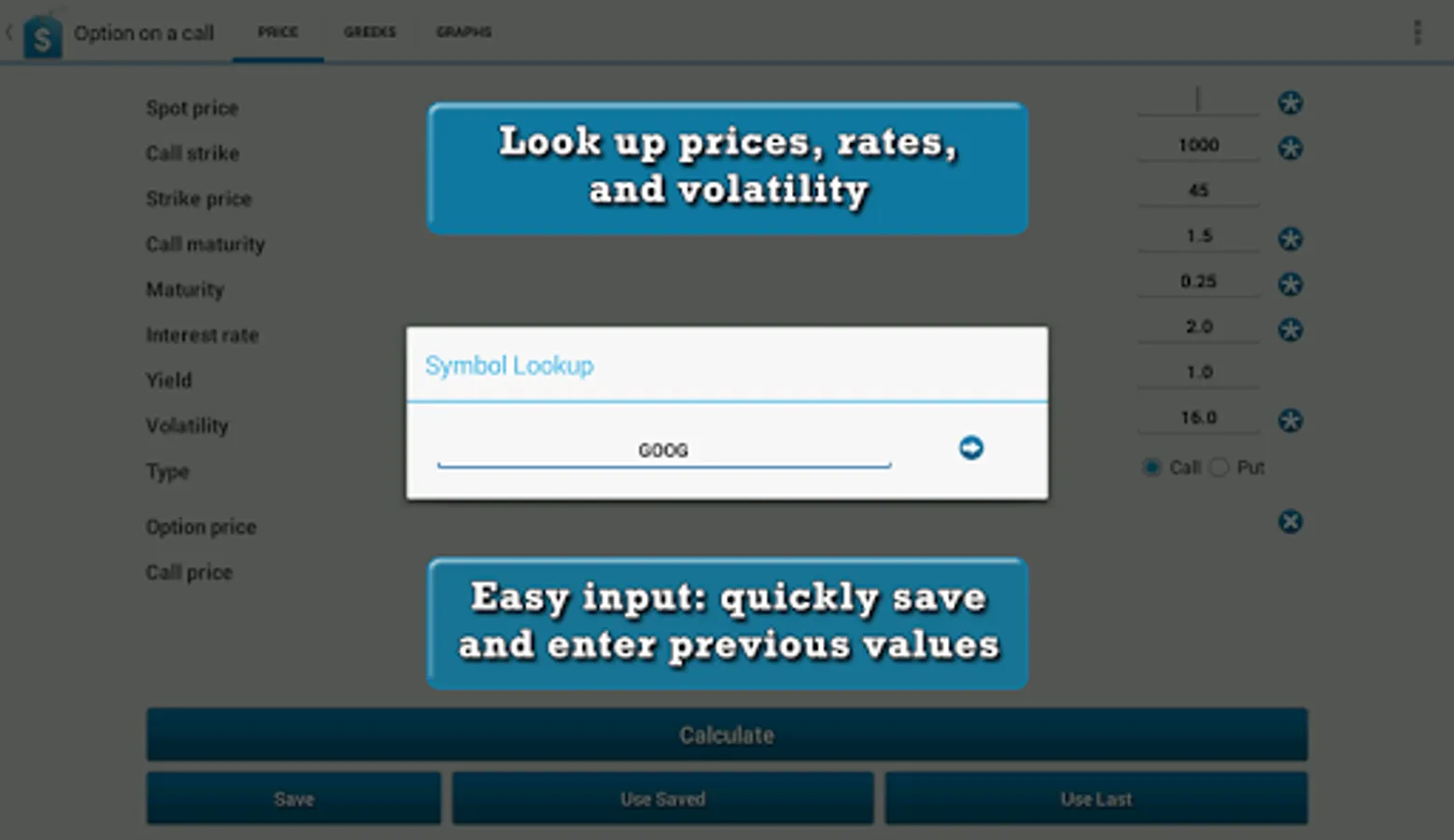 The user-friendly interface has easy input and extensive help. Automatic and manual saving of parameters allows for instant input and less repetitive typing. Other features include stock price lookup by ticker, interest rate and volatility feeds, and a calendar input for option maturity.