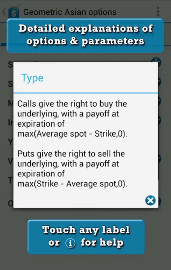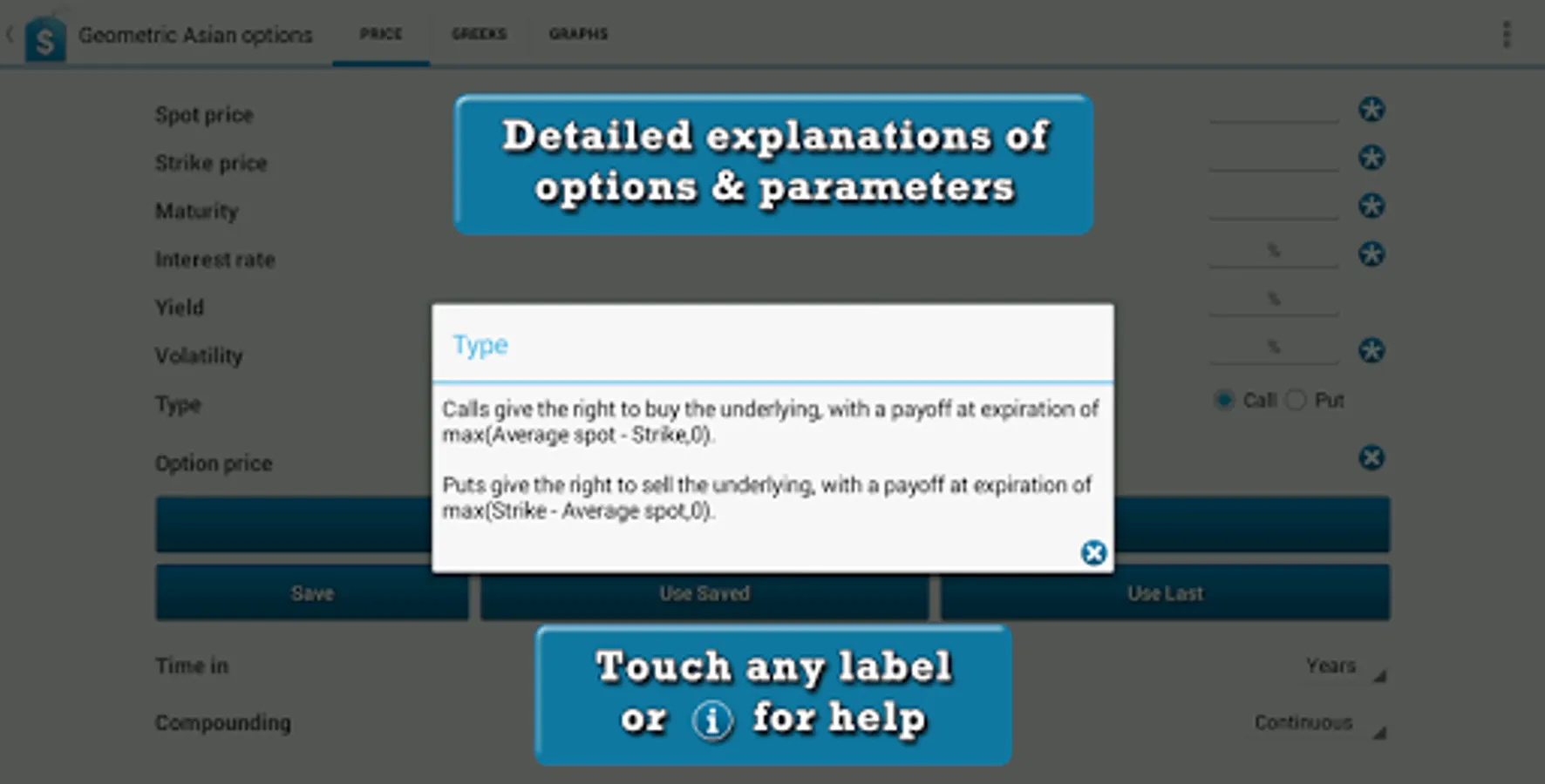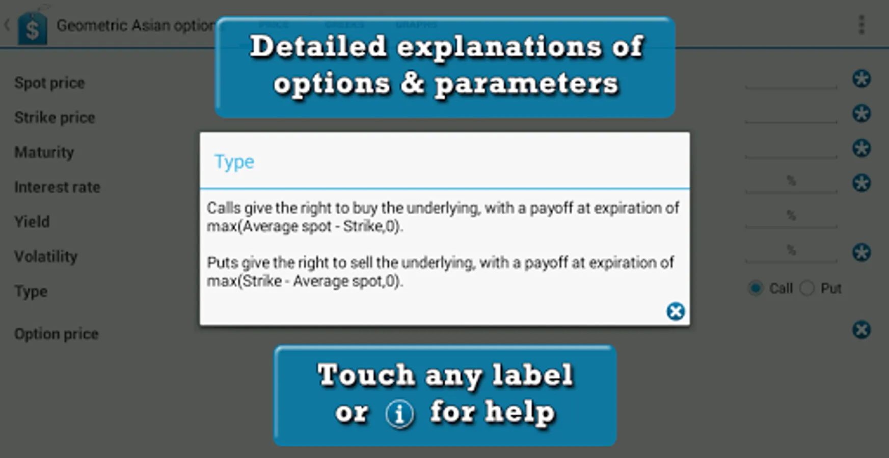 For help, use the info icons to view an explanation of each type of option, and touch any parameter or Greek text label for detailed information on its meaning.