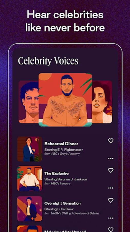Let Dipsea show you just how much celebrity star power translates to audio. Sarunas J. Jackson (HBO’s Insecure) has a deep baritone that sends vibrations through the floor. E.R. Fightmaster (ABC’s Grey’s Anatomy) can wink with their voice. And Luke Cook (Netflix’s Chilling Adventures of Sabrina) has an Aussie accent that makes you want to get into mischief.