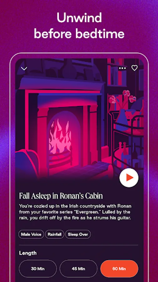 Suspend your state of pleasure and relaxation with sleep stories. Think back to when you were younger and felt comforted by the sound of loved ones in the house, or napped while a partner was working nearby. Dipsea Sleep Overs offer that same sense of cozy with some of your favorite characters. Or listen to Soundscapes of soothing and familiar sounds like a cabin fireplace during a thunderstorm, or rain on a cottage roof.