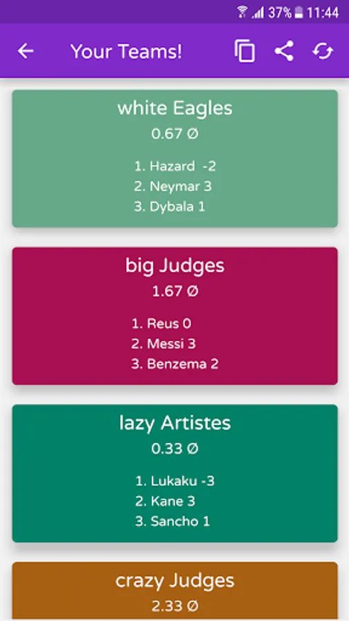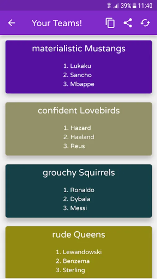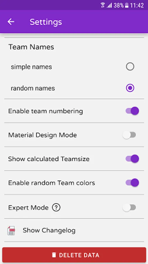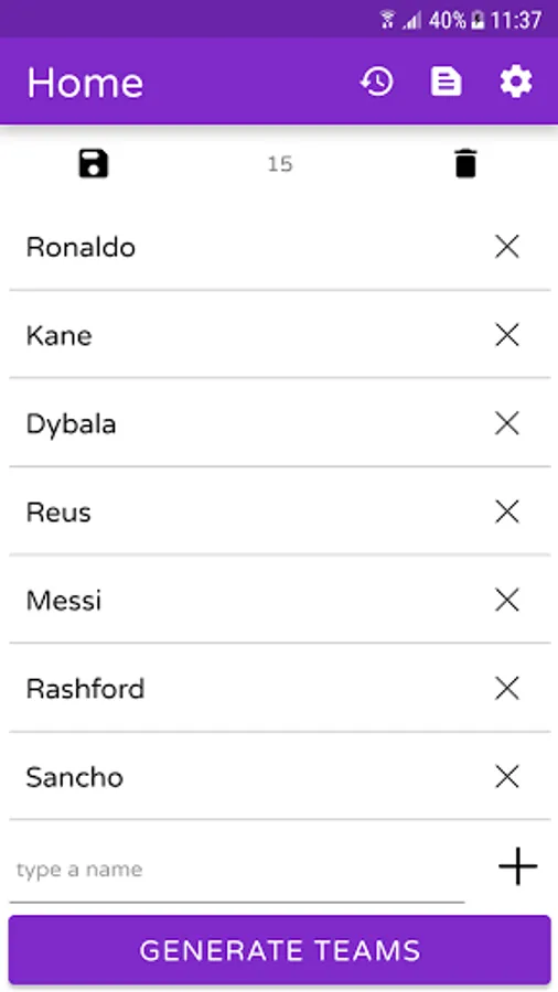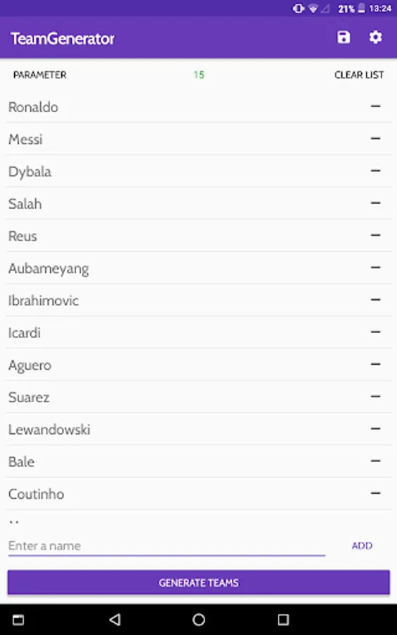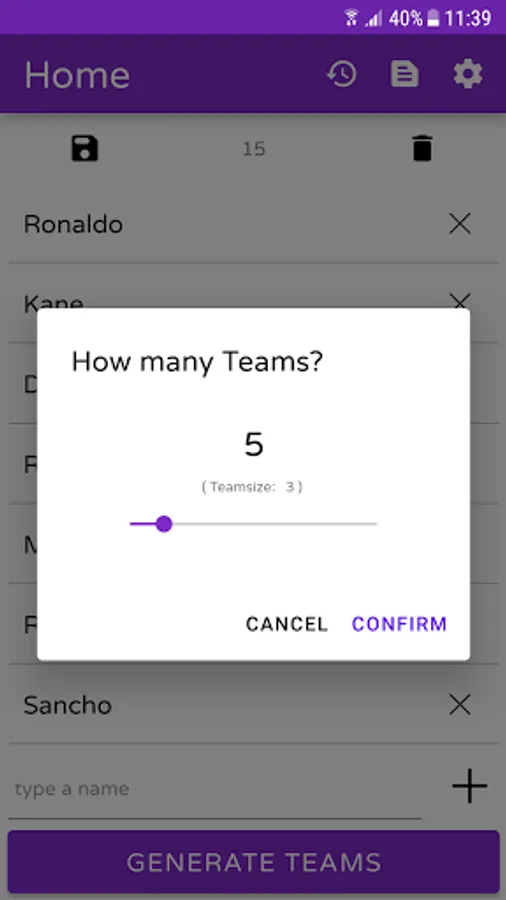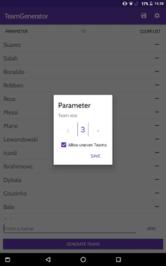 This App is as simple as possible to ensure simplicity and intuitive control. Just fill the list with names and set the teamsize. Then you are ready to go. Have Fun!