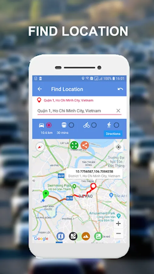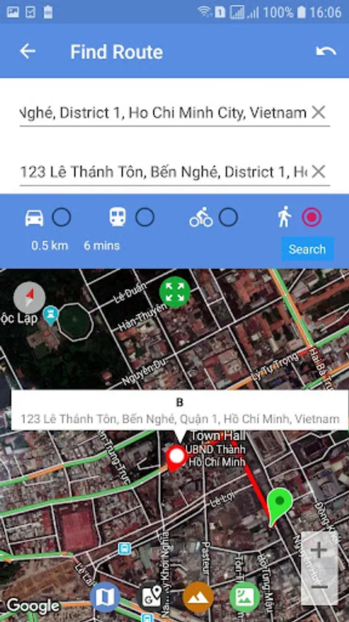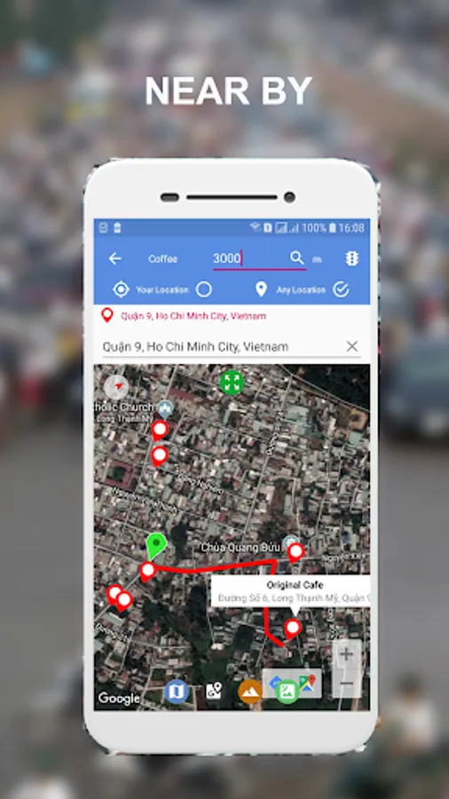 - Nearby : support 2 types - find from current your location to another location or find any place.