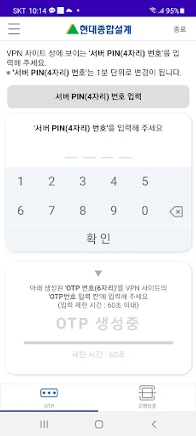 - After accessing the VPN service on the PC, enter the integrated login information (user number/password), and enter the PIN number (4 digits) provided by the server into the HDA-myOTP authentication app and press the OK button.