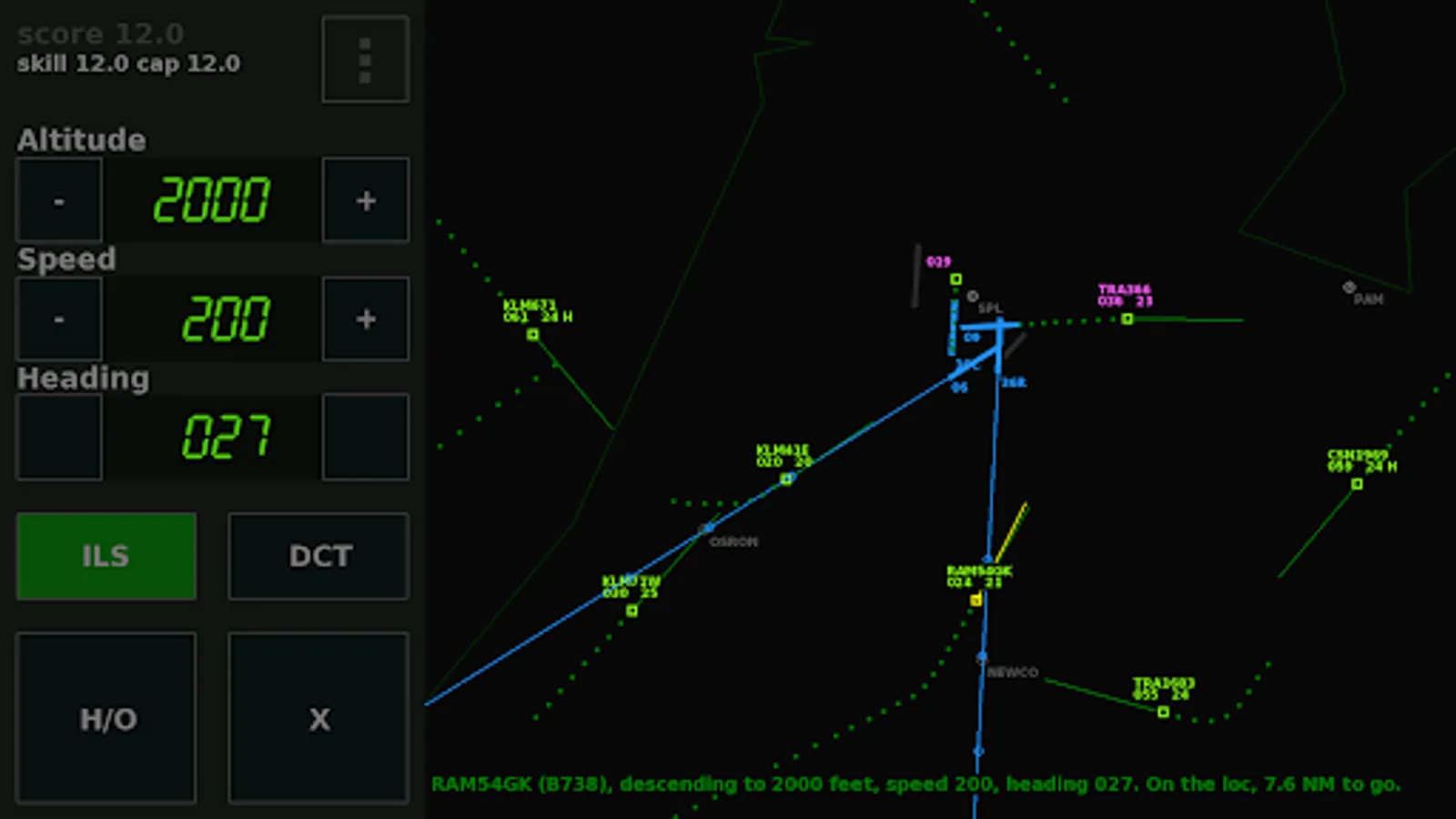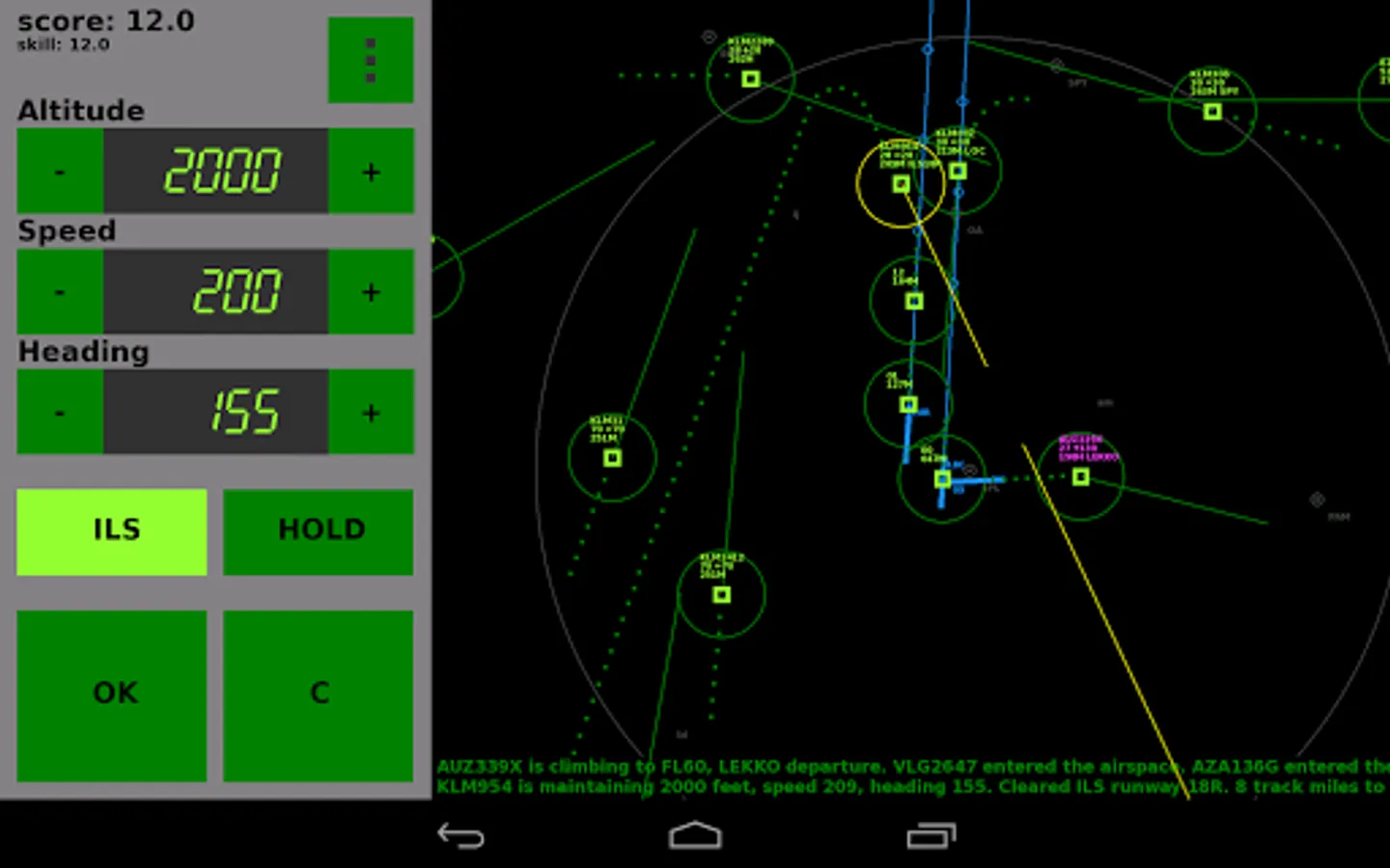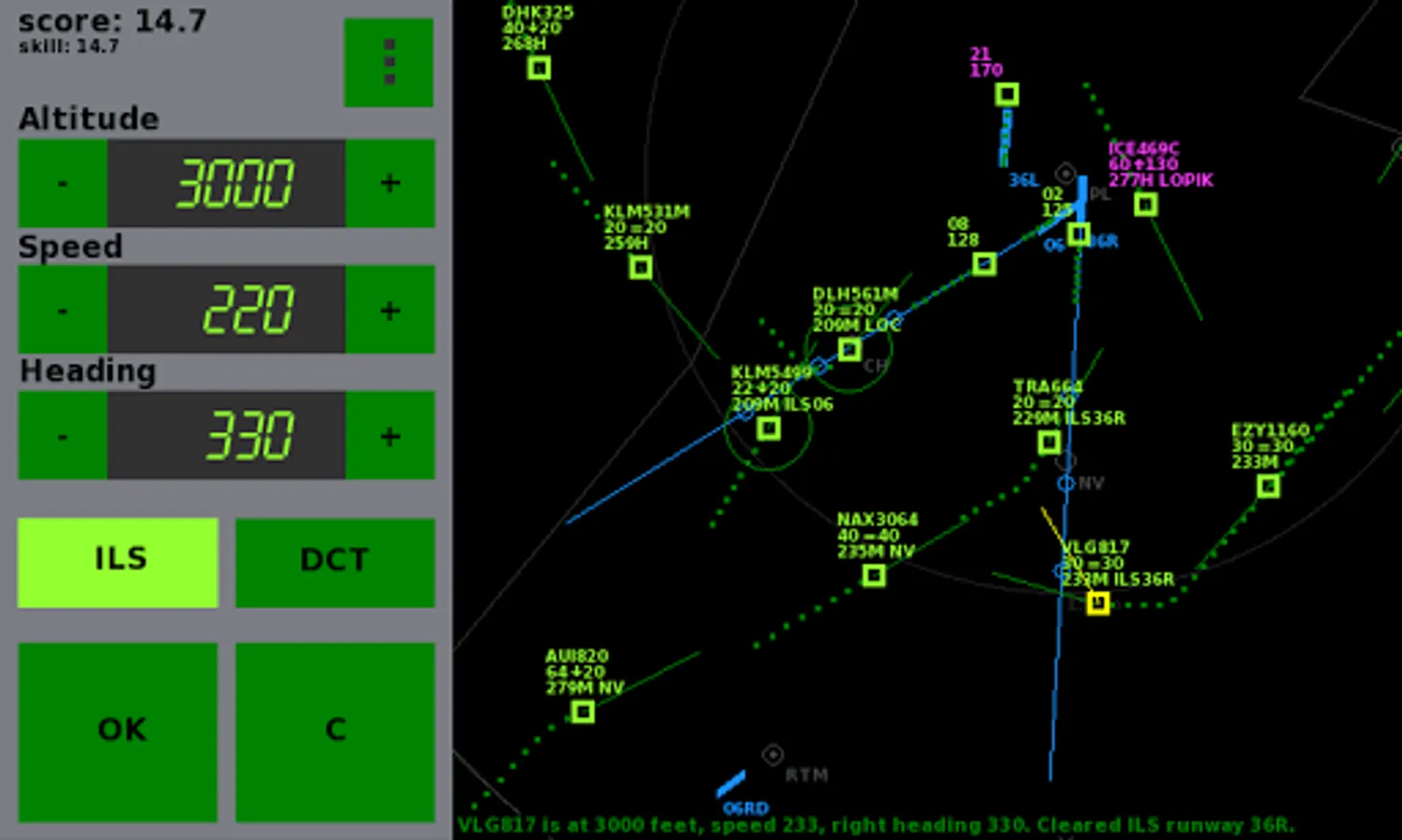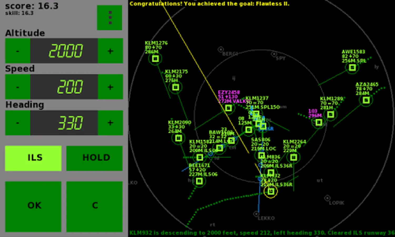 In this simulation game, you are the air traffic controller at the radar of a busy airport. The goal is to guide the airplanes safely towards the runway (using ILS approaches) to get a high score. If you make no errors, the number of planes you have to control gets greater and greater. How many flights at a time can you manage?