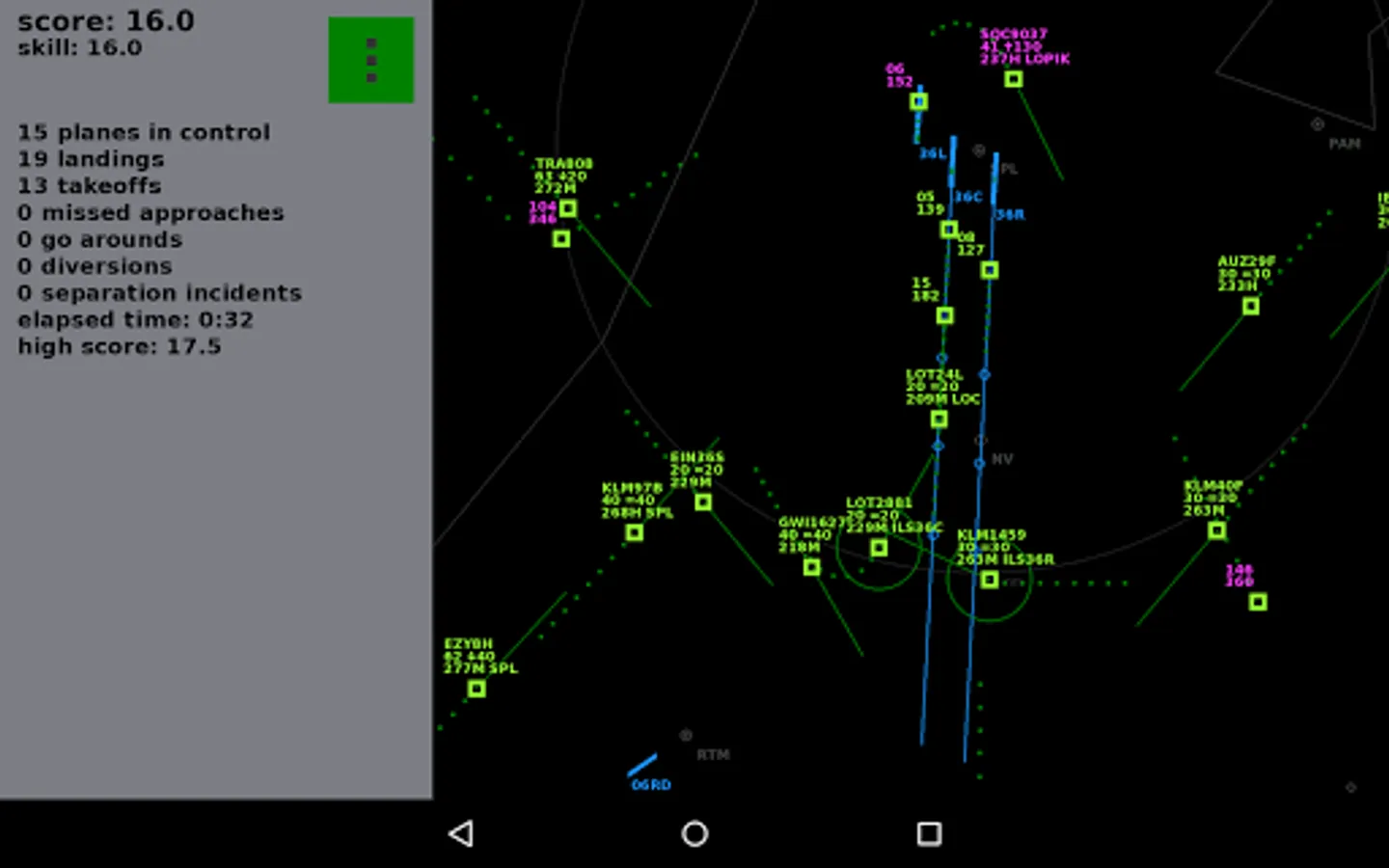 For each plane you lead to the runway, you gain skill points, and the more skill points, the more planes will enter the airspace. Departing aircraft determine their heading and speed themselves; they only require an instruction to climb to a higher altitude. When you make mistakes, the skill level goes down a bit. Some planes have an additional 'RD' tag; these planes should land on the secondary 'RD' airport. When landing at parallel runways, make sure both planes are 1000 feet vertically separated until both planes are on their localizer.