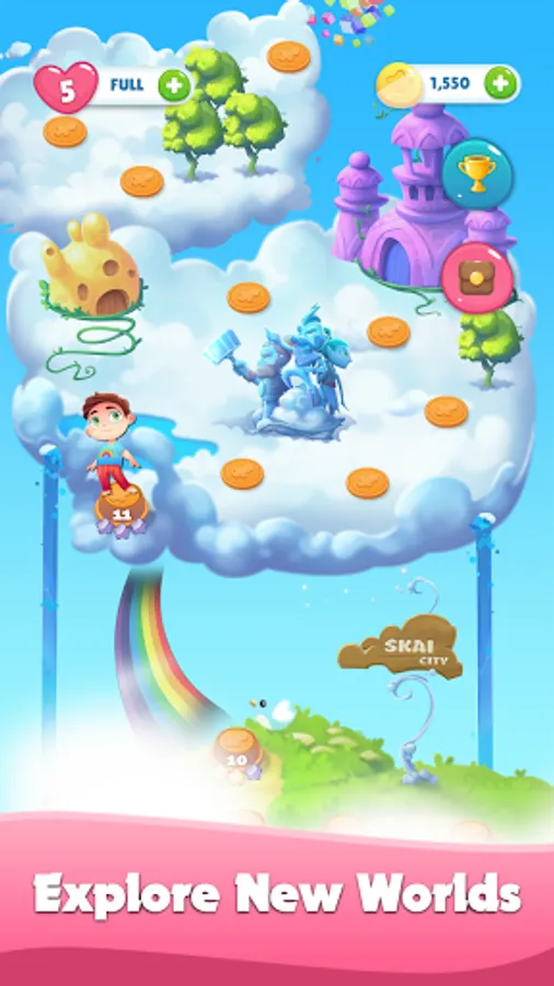 Help Indy explore the magical world of Skai and free it from the terrible Dark Giants! The rainbows of Skai have been thrown into chaos by these monsters, and Indy must drive them out and restore the glorious colors of the rainbows. Solve puzzles to swap tiles and arrange the mixed up colors of the rainbows in the correct order so that Indy and the citizens of Skai can once again ride free! 🎉