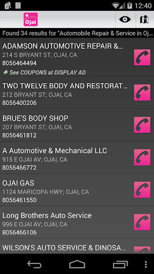 Visit Ojai is a free mobile search app powered by the Ojai Valley Directory, and is your number one mobile app for the phone book that covers the entire Ojai Valley, including the city of Ojai, and the communities of Oak View, Meiners Oaks, Mira Monte, Lake Casitas and Upper Ojai. The Visit Ojai app is your local search provider for all categories of products and services available in the Ojai Valley, including air conditioning repair, automobile services, attorneys, beauticians, contractors, doctors and dentists, lodging facilities