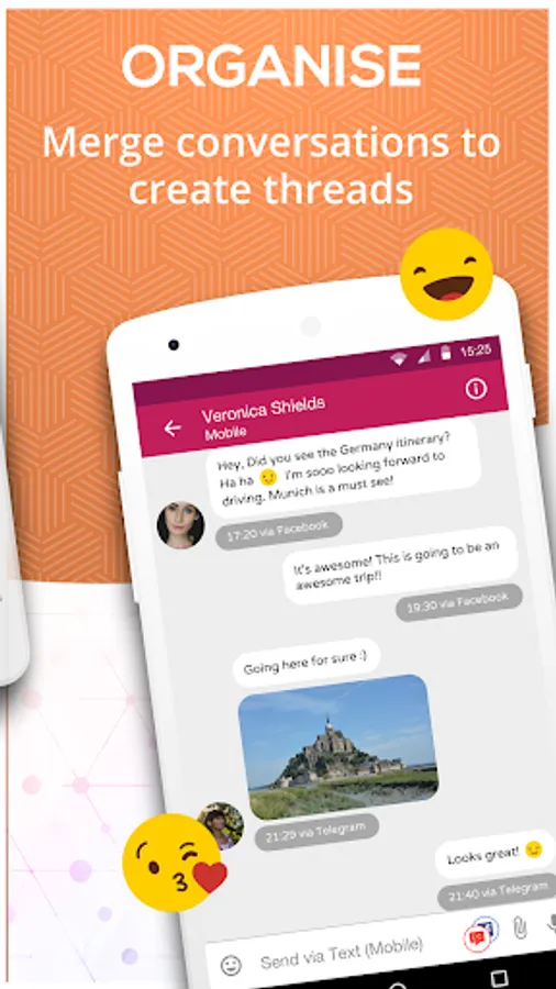 Additionally, the app offers multiple settings and customisation options to organize your messages. You can personalize your chatting experience, create mixed groups with contacts from any messaging service, set different font colors for text & message bubbles, send videos & emojis & do a lot more, all for FREE!