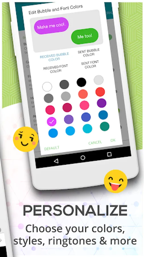 You have a long list of service personalization options to select from, including the ringtone & vibration pattern, snoozing and enabling/disabling notifications. Select your favorite chat bubble & font colors from a long list of options. Set a wallpaper of your choice.