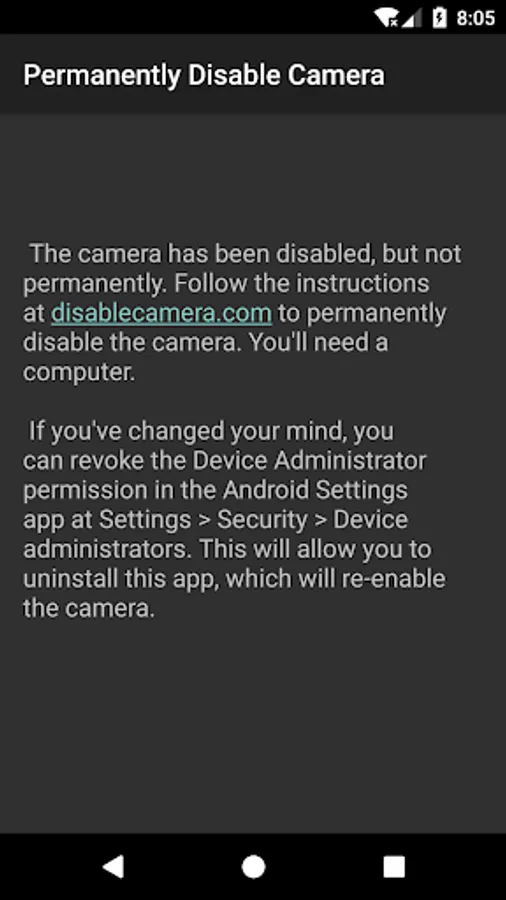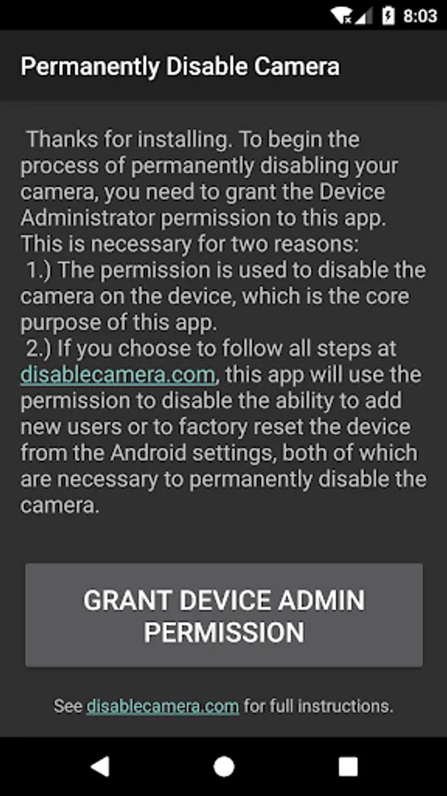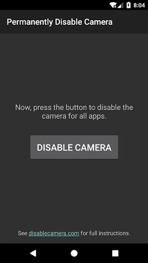 Permanently Disable Camera disables all cameras on your Android device, then guides you through some manual steps to make the app installed permanently so that the cameras cannot be re-enabled. Once those steps are followed, the app also removes the ability to add new users to your device or to do a factory reset of the device through the settings menu, since either of those could effectively allow the cameras to be re-enabled.