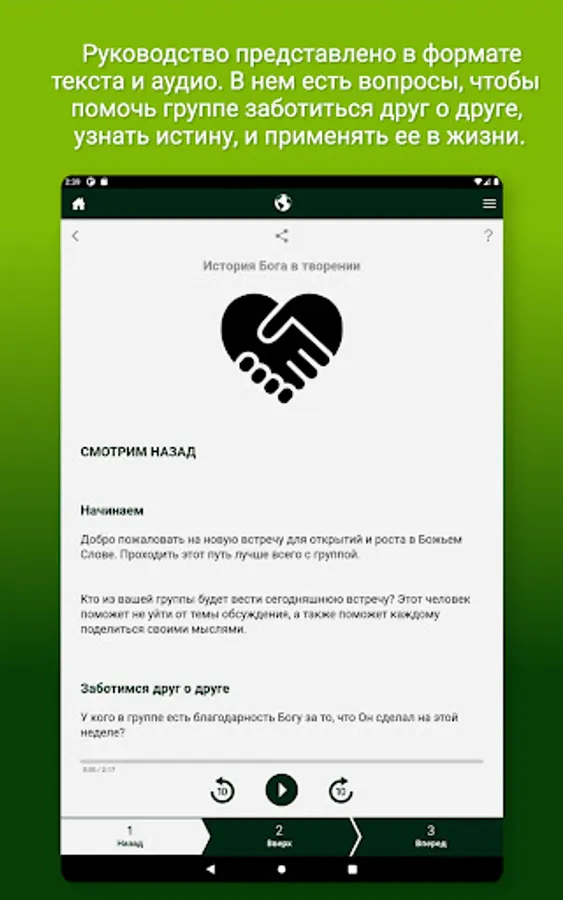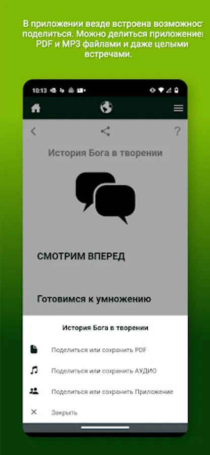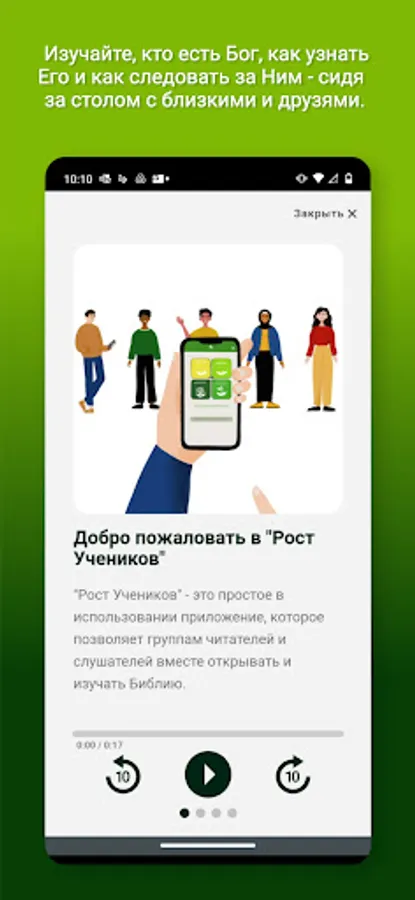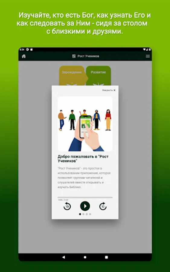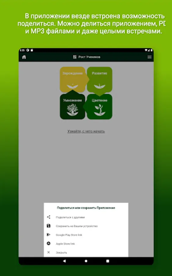 App "Growth of Disciples" - will always be free. It provides ways to help you share PDF stories or MP3 audio files that describe the meeting. The app contains helpful instructions, contact information for a coach to help you, as well as additional life-related topics, a privacy lock screen, and more.