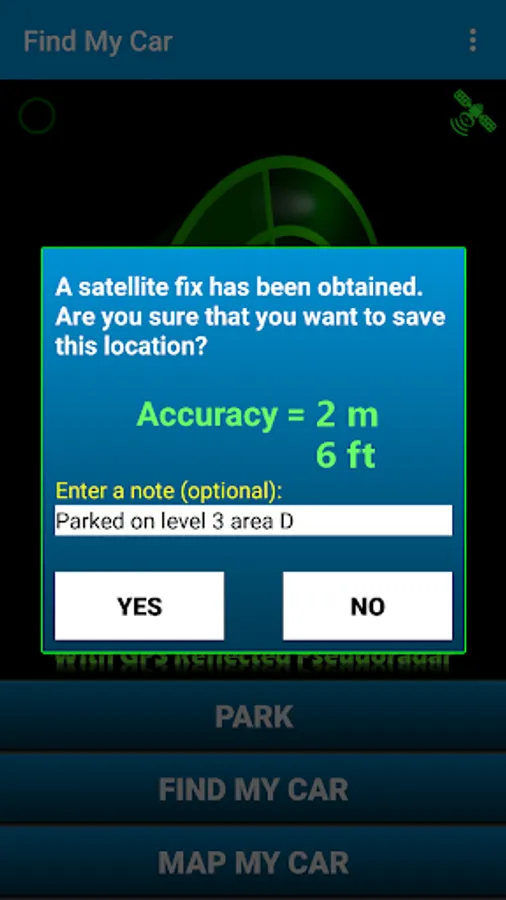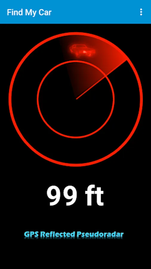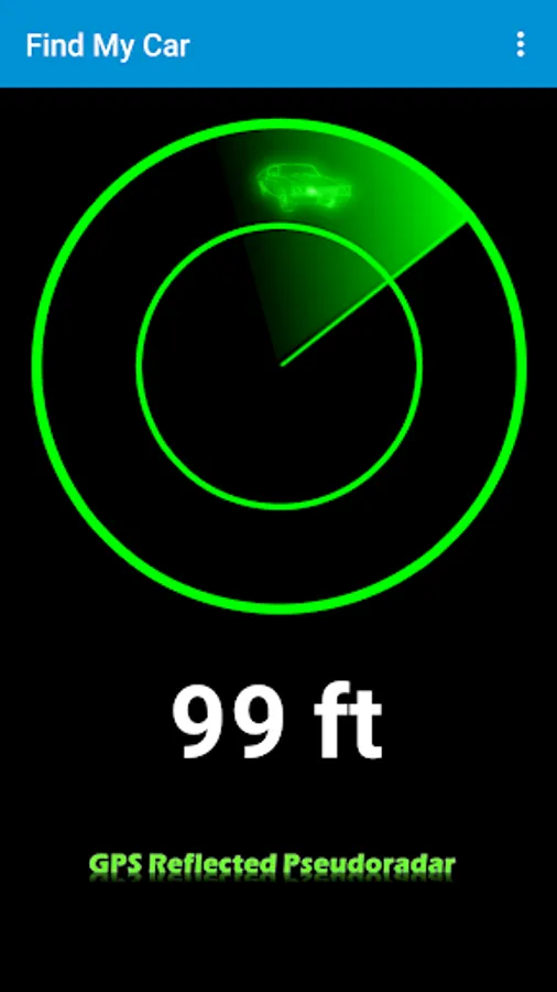 🚗 GPS Reflected Pseudoradar. You are at the center of the radar screen. Your car will glow when hit by the radar sweeper. Keep walking until your car joins you at the center of the screen. Internet not required.