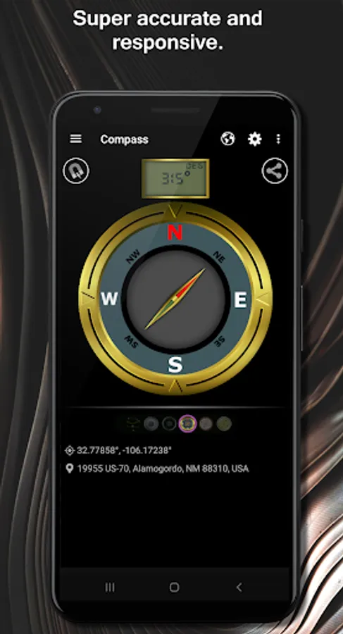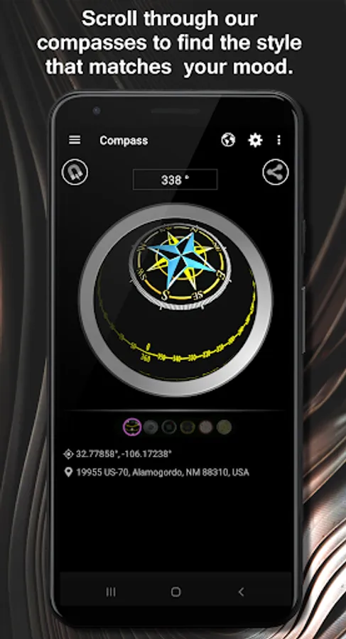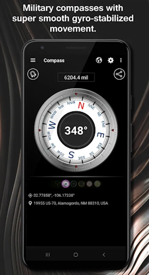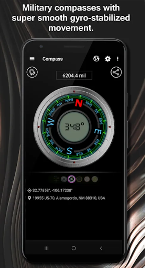 Each compass works in either magnetic or GPS mode and has plenty of tools for adjusting look and performance characteristics. In magnet mode, the magnetic declination for your location is automatically calculated to show the offset from true north. Or, show offset from magnetic north, like a real compass, if that is your preference. All magnetic compasses in our app receive gyroscopic stabilization on devices with a built-in gyroscope sensor. Gyroscopic stabilization allows for the smoothest compass operation.
