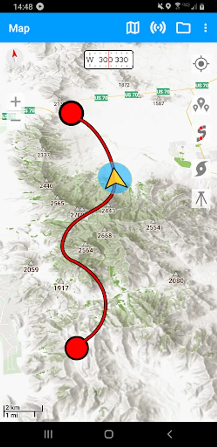 View your previously recorded trails and waypoints on any map or add trails and waypoints from a kml or kmz file. All maps have custom built-in compasses and measurement tools to enhance your location awareness.