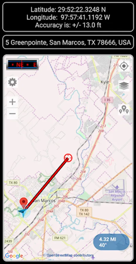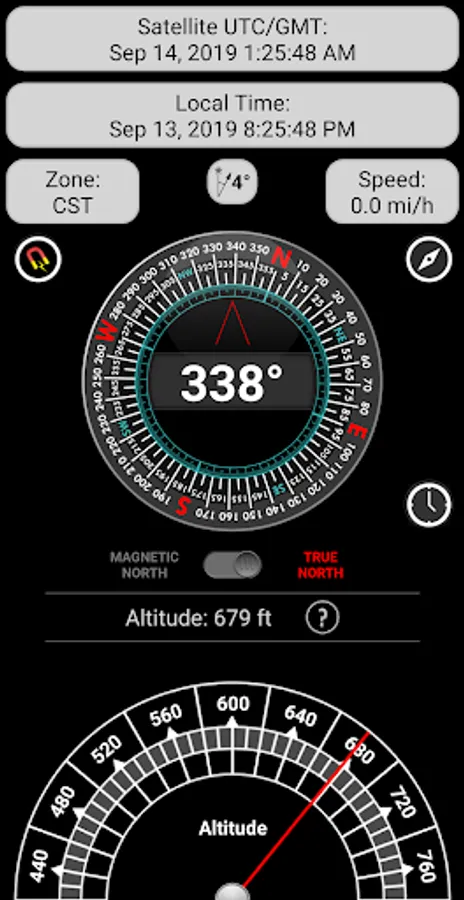 In addition to location and satellite reporting, the app will calculate all kinds of interesting figures such as your altitude, distance to points of interest, physical addresses, sunrise, sunset, moon phases and much more. Your position and the date are used to calculate the magnetic declination for your location allowing magnetic compasses in the application to report deviation from true north instead of magnetic north. The true-north-reporting compasses work very nicely with the maps which can be oriented along the true north-south axis or rotated to your heading, depending on your preference.