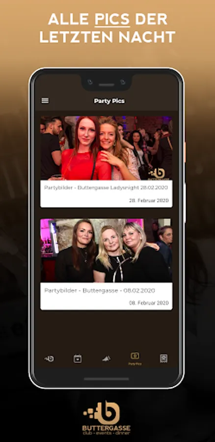 You'll be the first to know when the next party is on and you'll benefit from great promotions. You save money with our vouchers for the event. We provide all the party pics in the app so that you can remember the awesome evening the day after.