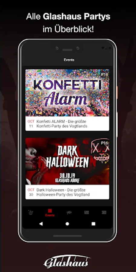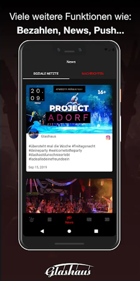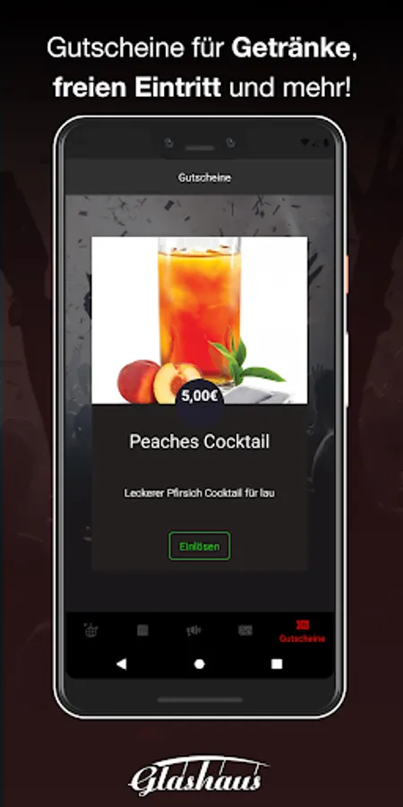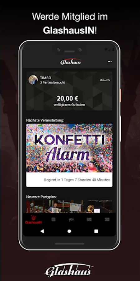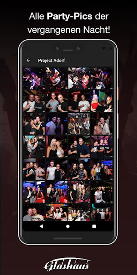 Download our app and become a member of the exclusive GlashausIN Club. So you'll be the first to know when the next party is about to start, and you'll still benefit from fat actions. For the party you save cash with our vouchers (or you can order more) and pay everything by app. So that you can remember the next day after the great evening, we provide all party pics in the app.