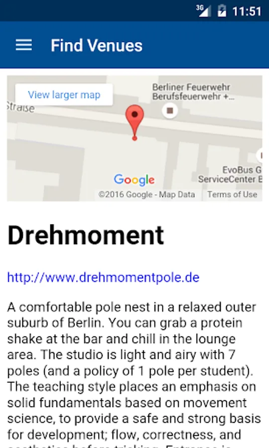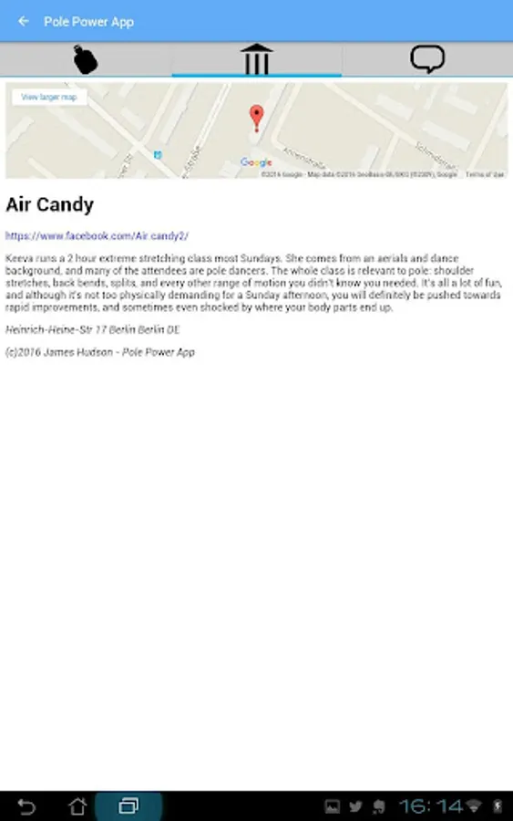 • Discover the nearest pole venues wherever you are in the world. From huge Berlin converted warehouses, to beachside Caribbean pole schools, you'll find something new near you! Convenient information and directions will take you straight there.