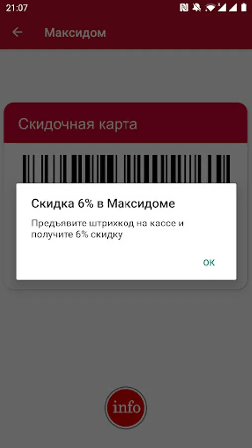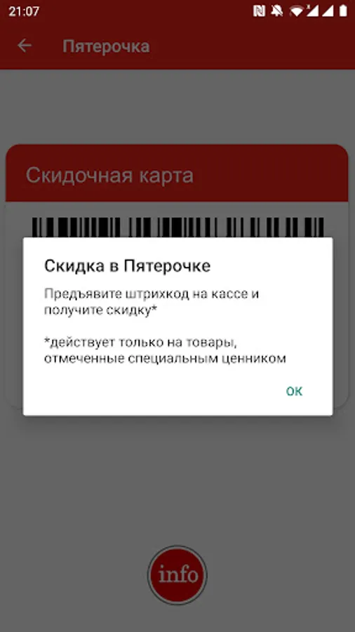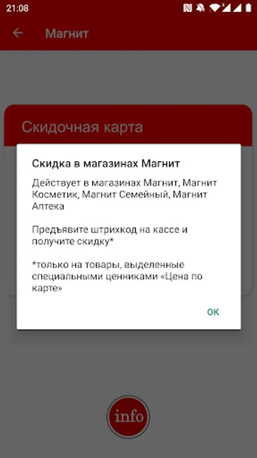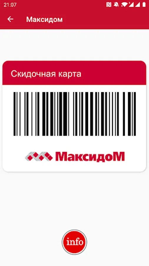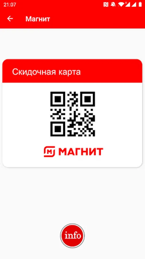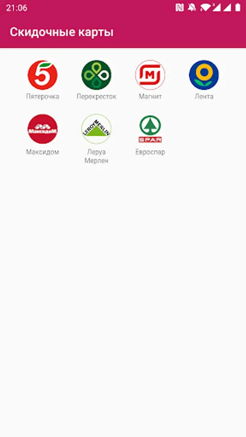 Discount, discount and other cards * stores in one application: Pyaterochka, Magnit, Magnet Family, Magnet Cosmetic, Magnet Pharmacy, Crossroads, Tape, Maxidom (Maxidom), Leroy Merlin (Leroy Merlin), Spar (Spar / Eurospar).