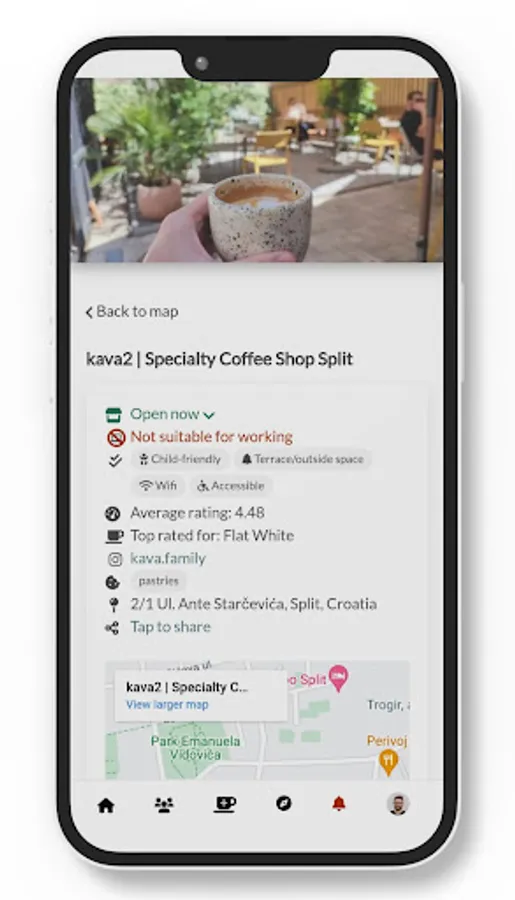 Browse our curated map of specialty coffee shops. See how other Kava users have rated their coffees and check what beverage the café is top rated for. Need to do some work? Find coffee shops that are laptop friendly. Hungry? See what food is on offer. Need some fresh air? Find coffee shops that have outside space.