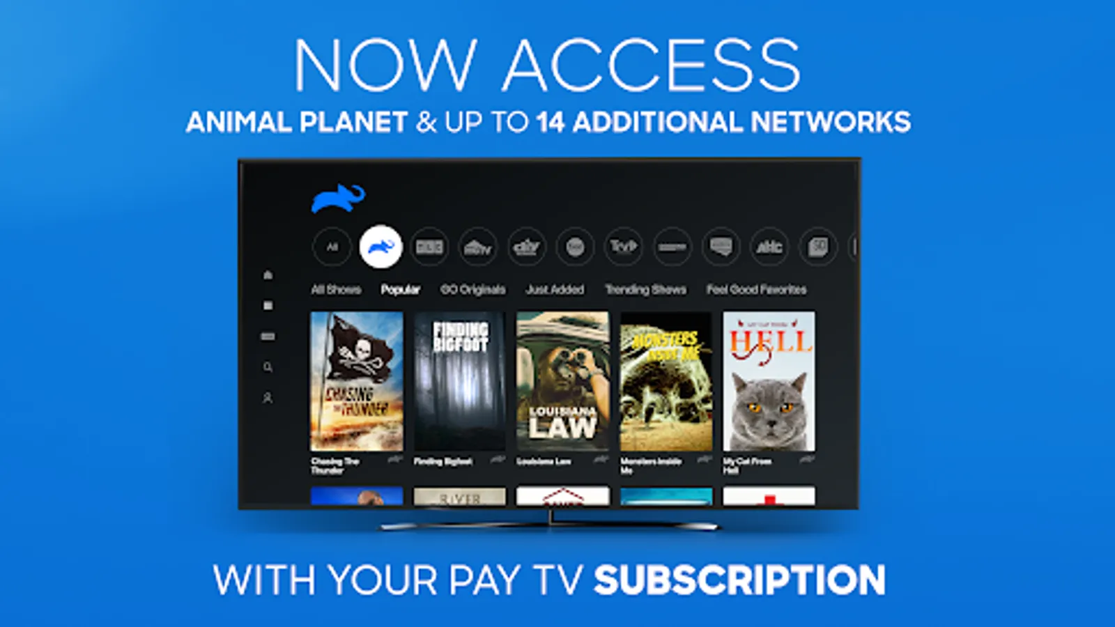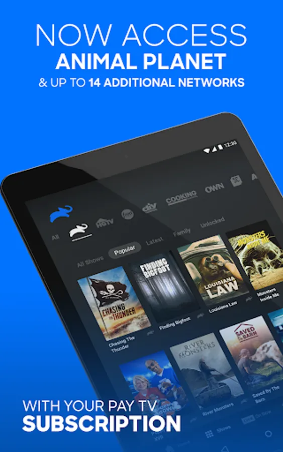 Catch up with your favorite Animal Planet shows anytime, anywhere with the all-new Animal Planet GO app - and now get access to up to 14 additional networks including TLC, Discovery, Science Channel, Travel Channel and more - all in one app. It’s FREE with your pay TV subscription.