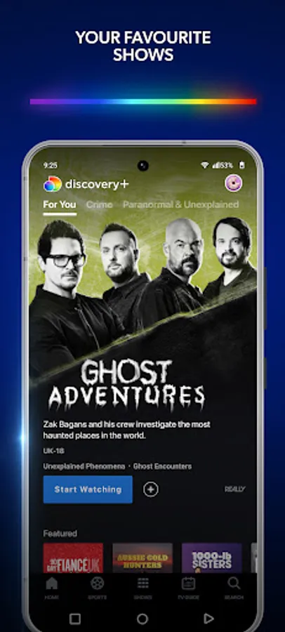 discovery+ is the streaming home of Food, Home, Travel, True Crime, Paranormal and so much more. Watch exciting, can’t miss Original series plus all your favorite shows from the best TV brands. Stream the live sports you love with TNT Sports channels (only available in the UK) and Eurosport (outside of the UK)*. There's something for everyone!