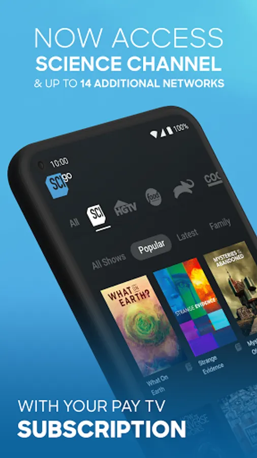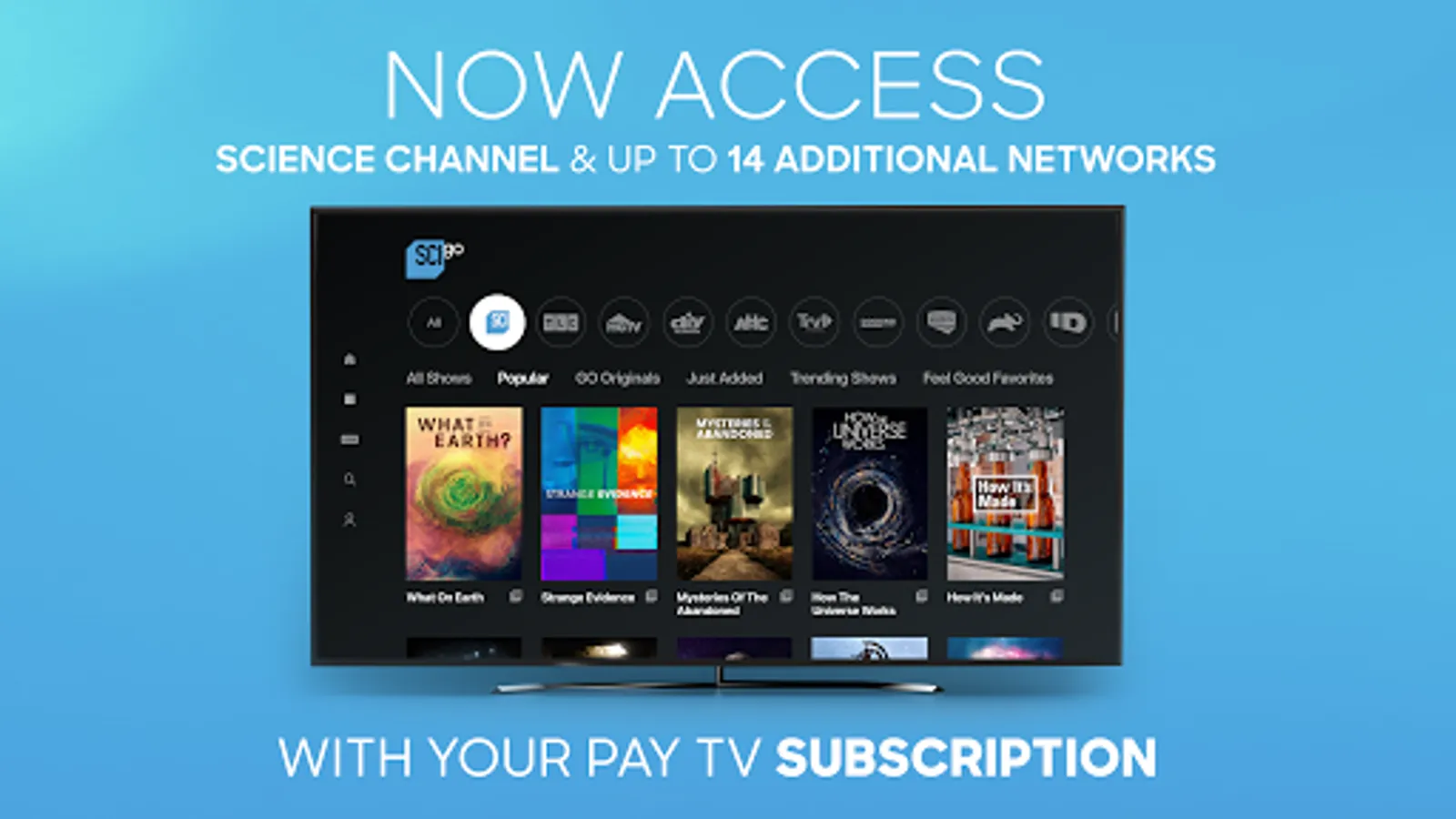 Catch up with your favorite Science Channel shows anytime, anywhere with the all-new Science Channel GO app - and now get access to up to 14 additional networks including Discovery, Travel Channel, ID, TLC and more - all in one app. It’s FREE with your pay TV subscription.