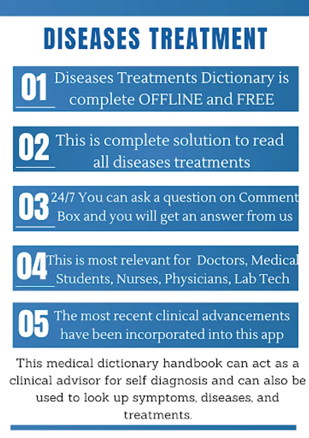 This is a general solution to learning all diseases by Diseases Treatment Dictionary. It absolutely works offline, and all newcomers who are interested in learning about diseases and medical information will find it helpful. Please refer to our users reviews and ratings in the Play Store.