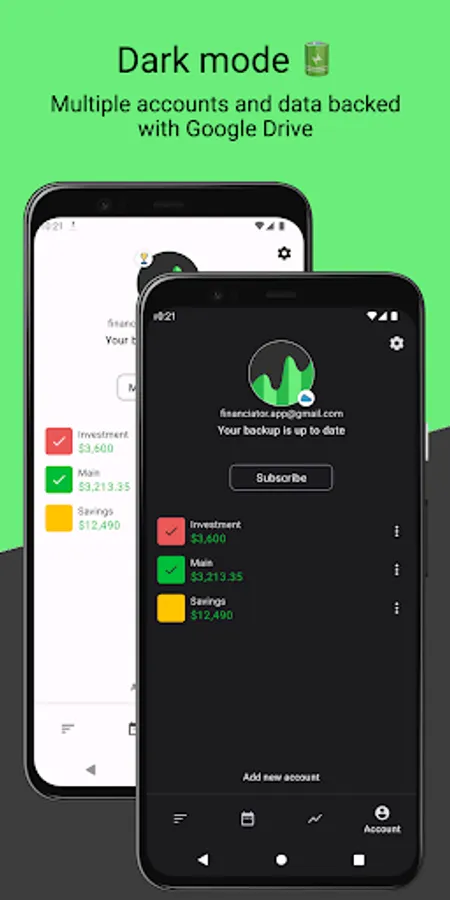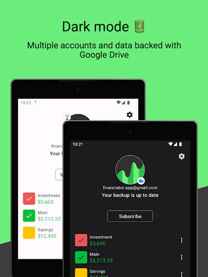 Data & Security: We take security seriously at Financiator. Protect your data from nosy people with a PIN code and backup your data using Google Drive.
